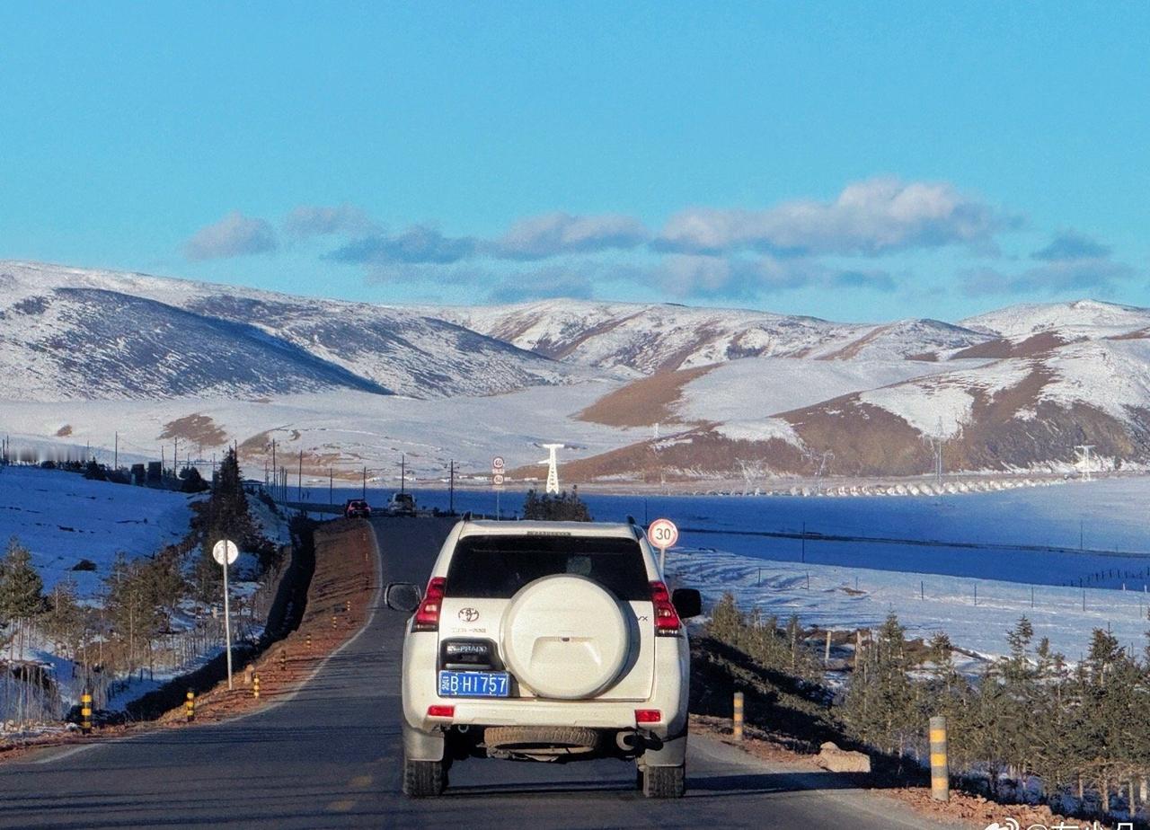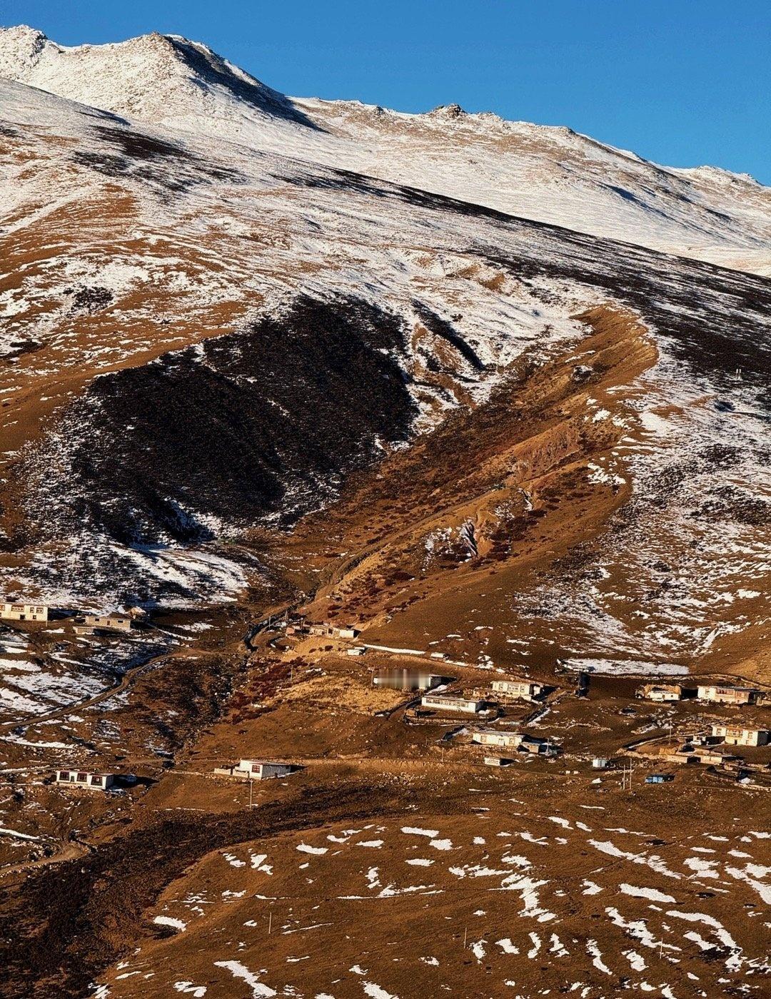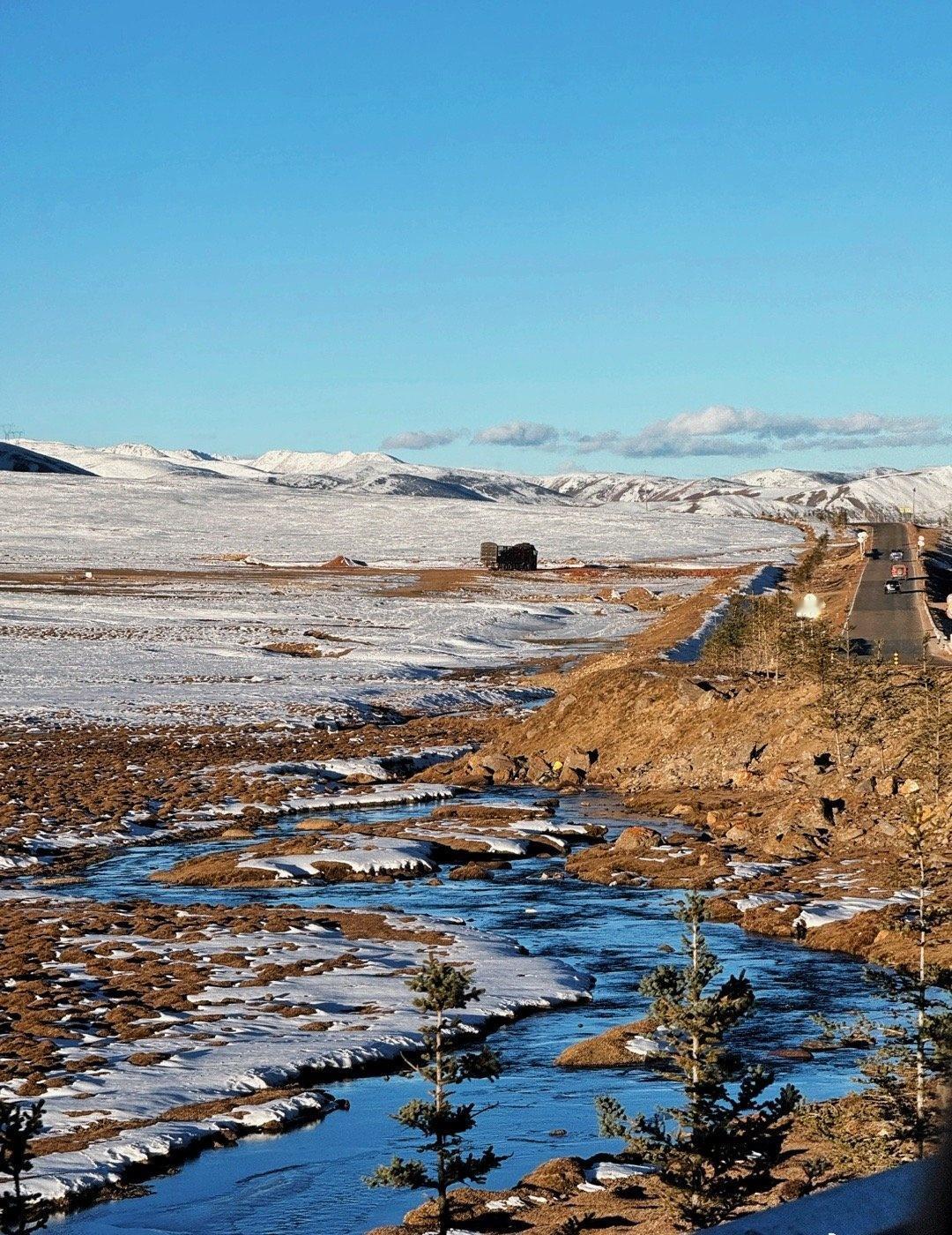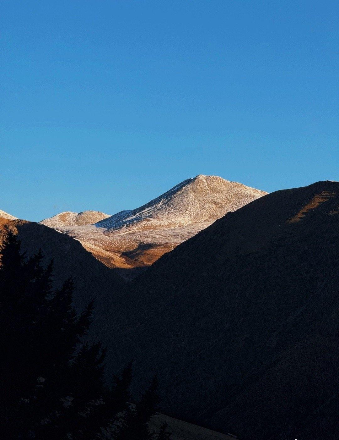 从昌都出发到邦达机场, 会看到月亮像个印章一样挂在天上, 而东边的阳光又撒满了整个山峰。 会路过白雪皑皑的邦达草原, 排排坐的电塔形成了一条奇特的天路。 海拔一路上升, 从3200多米到4300多米, 最后回到300米。