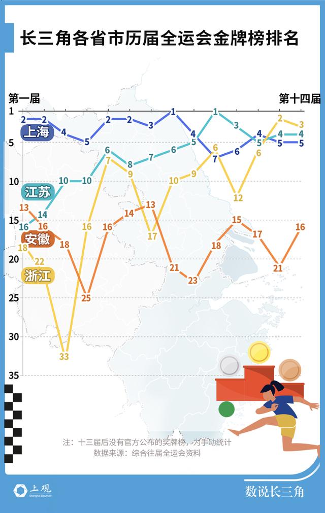 在历届全运会金牌榜排名中,上海长期位居金牌榜前列,第一、二届均保持第二,第八届登顶,其余也均保持在前十名内;同样稳定表现的还有安徽,虽然未进入前十名,但十四届全运会金牌榜有所上升,奖牌总数也从29枚提高到33枚。江苏和浙江在排名上提升明显,江苏从前四届均未进入前十,升至第八届第六名,并且此后一直保持在前五;浙江从曾经第三届排名30余名,提升至第十三届第二、第十四届第三,保持第一梯队。