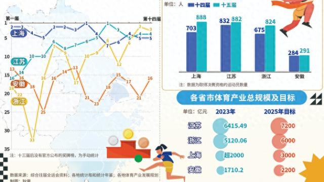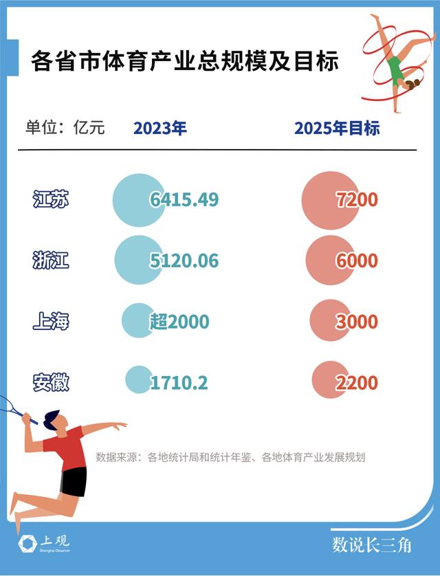 从体育产业总规模看,江苏省2023年体育产业总规模高达6415.49亿元,正朝着2025年7200亿元的目标稳步迈进,浙江将冲击6000亿元,上海目标定为3000亿元,安徽则为2200亿元。