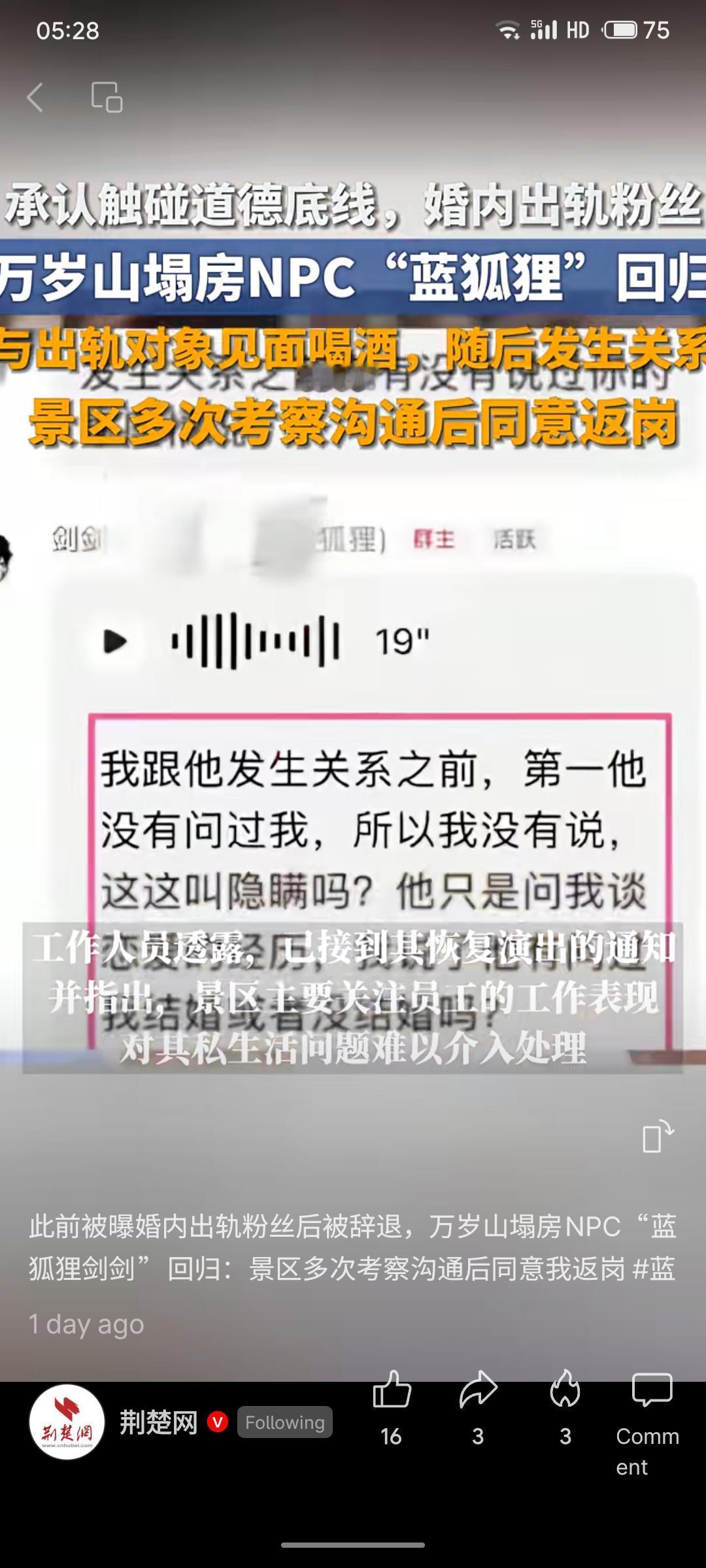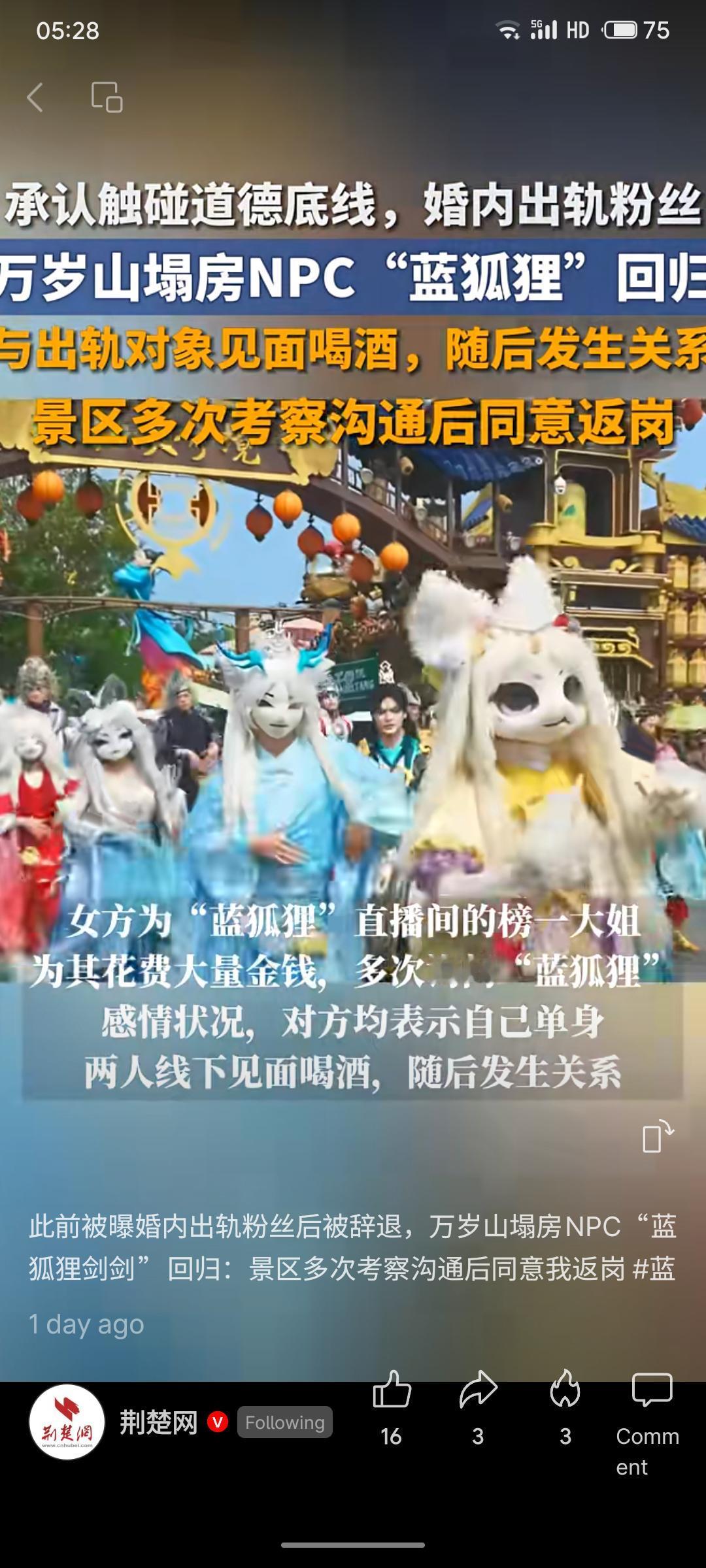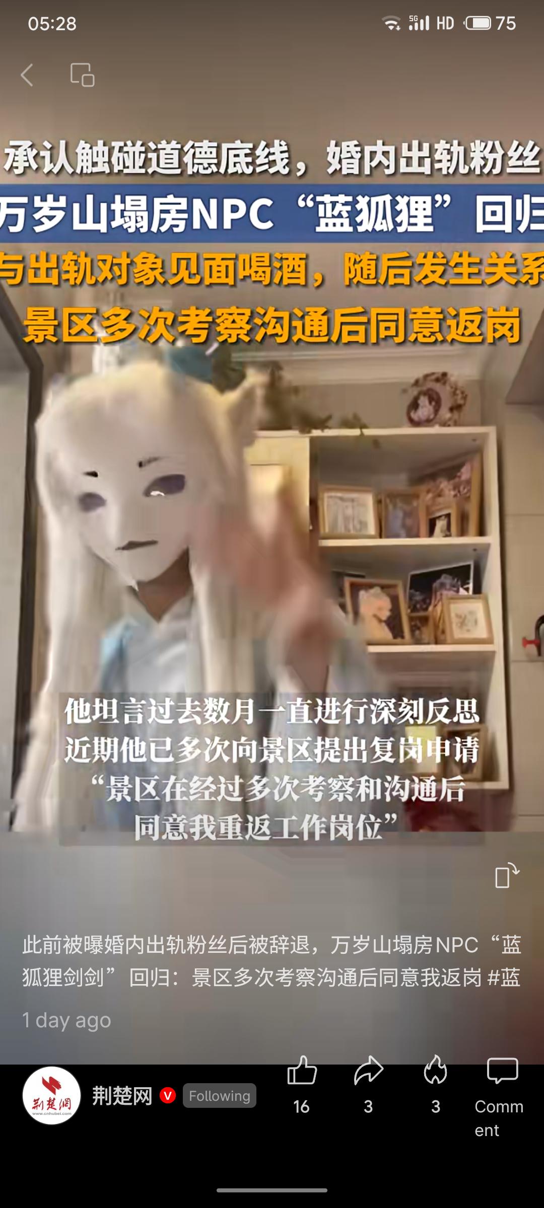 万岁山武侠城NPC演员“蓝狐狸剑剑”被曝婚内出轨直播间“榜一大姐”,隐瞒已婚状况并与对方发生关系。事后他承认触碰道德底线,曾被景区辞退。经数月反思及景区多次考察沟通,近日已获准重返岗位,引发网络关注。