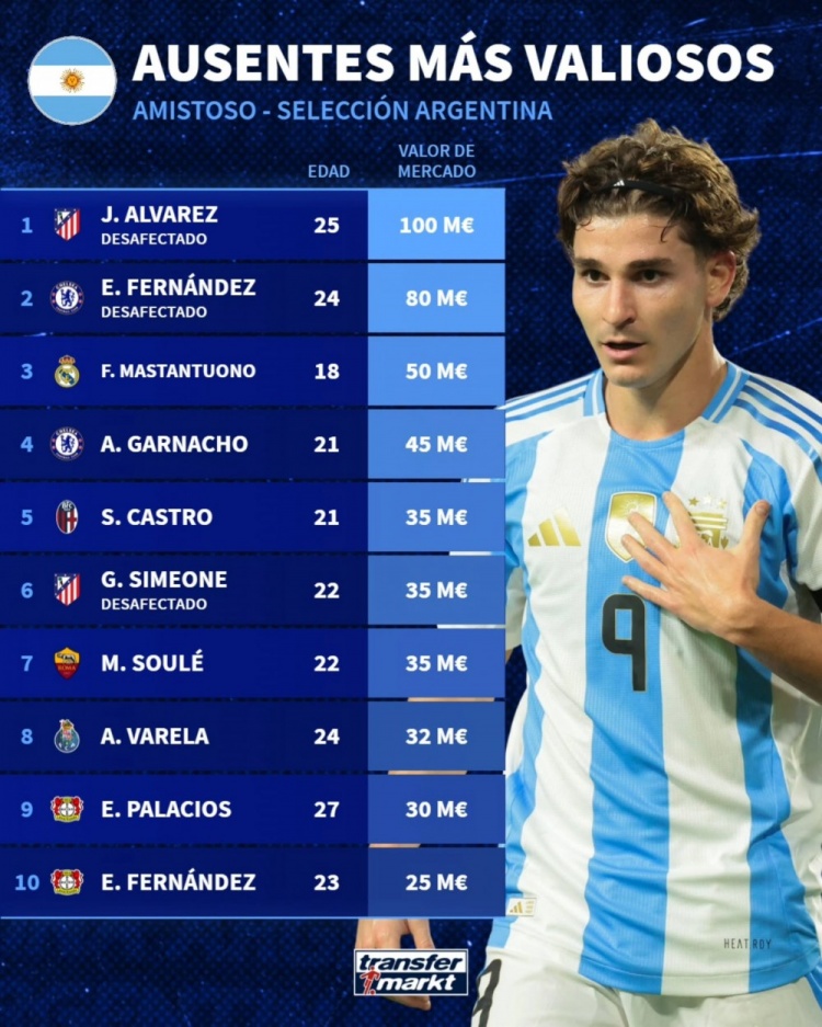 直播吧11月12日讯德国转会市场统计了缺席本期阿根廷队球员的身价,并列出榜单,阿尔瓦雷斯1亿欧居首,恩佐-费尔南德斯8000万欧次席。