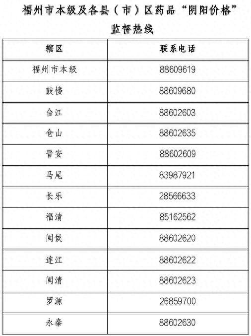 福州市本级及各县(市)区药品“阴阳价格”监督热线