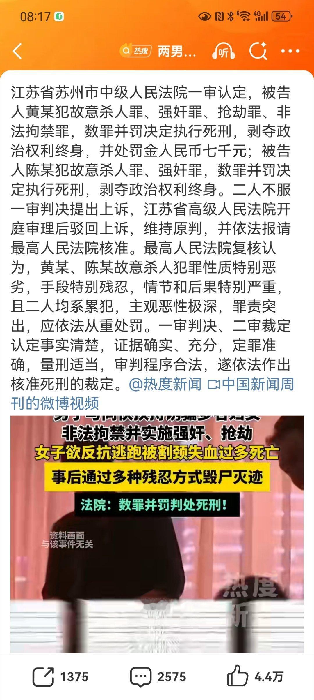 【】最高人民法院近期核准了对黄某、陈某的死刑裁定。两犯在2019年刑满释放后,预谋并实施绑架、非法拘禁、强奸、抢劫多名女性,并残忍杀害其中一名被害人,犯罪手段极其恶劣,且均系累犯。对如此罪行累累、手段残忍的累犯,死刑判决是法律的正义彰显。此类恶性案件确实应推动“快审快结快执行”,这不仅能节约司法成本,更能避免漫长诉讼对受害者家属造成二次伤害,让正义尽早得到伸张,给生者以告慰。高效的司法程序本身就是对法治尊严的维护。