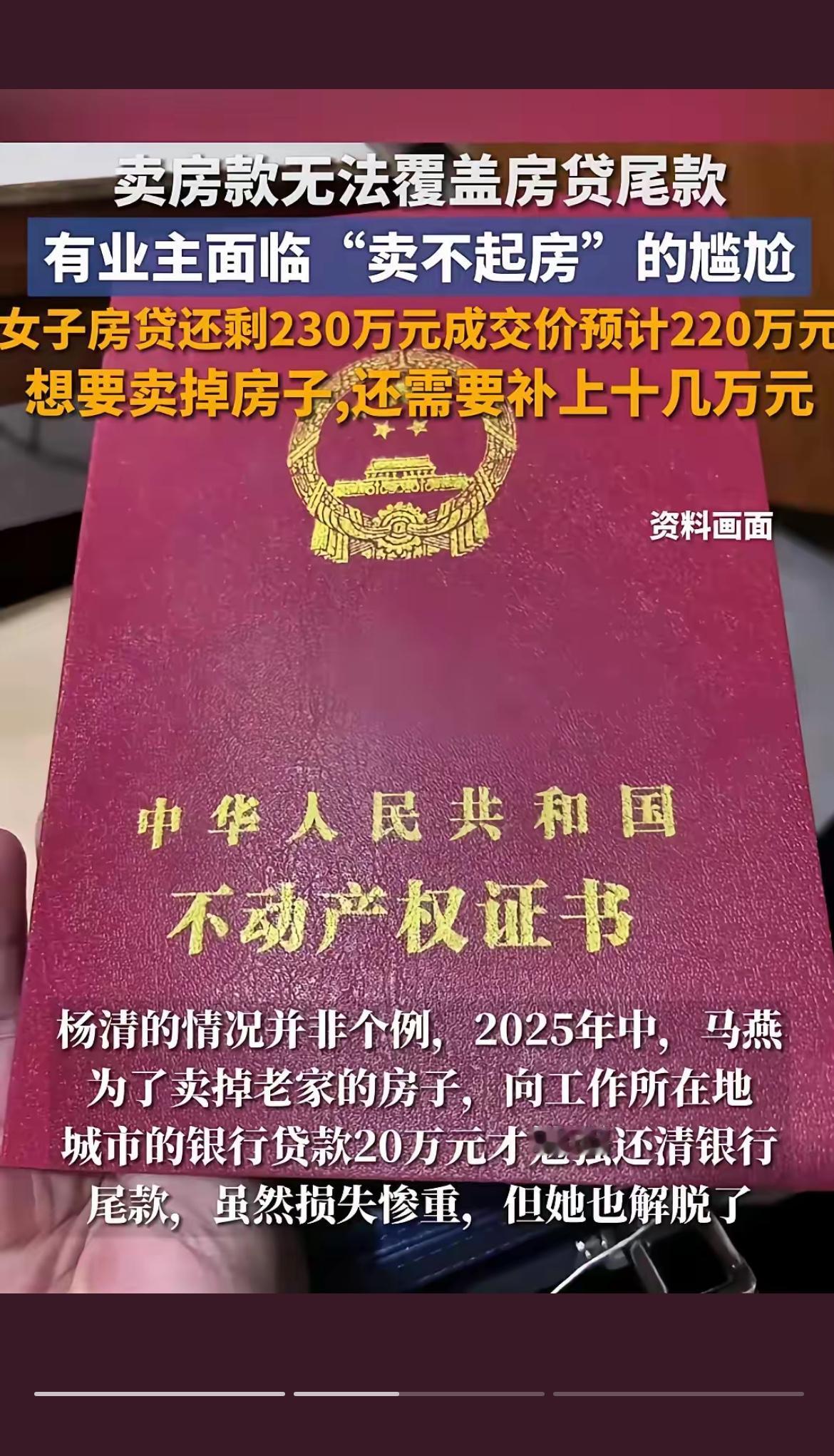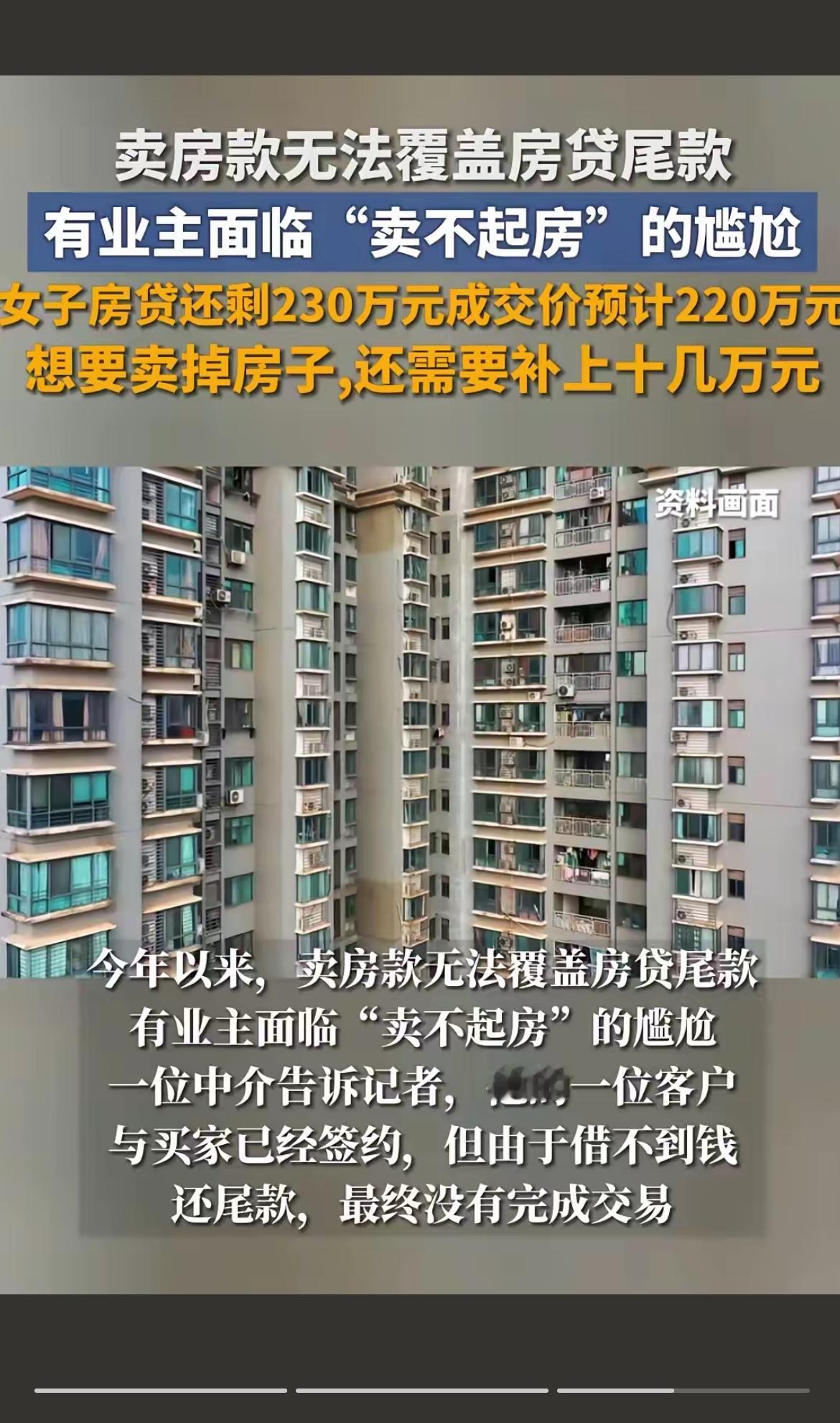 现在好多人面临卖房款无法覆盖房贷尾款的尴尬。就像我和媳妇去商转公时,和银行经理聊到卖房,我这套房卖了还完贷款就剩10多万。他19年高峰买的房,现在跌到1/3价,卖房款根本不够还房贷,想卖都卖不起。 还有深圳中介晒出的“贷款卖房”案例,《经济观察报》报道马燕为卖房得再贷款20万还尾款。可“贷款卖房”风险不小,申请消费贷还房贷可能违规,中介过桥贷多数业主又不符合要求。二手房价格下行,让“房贷倒挂”成了很多人的难题。