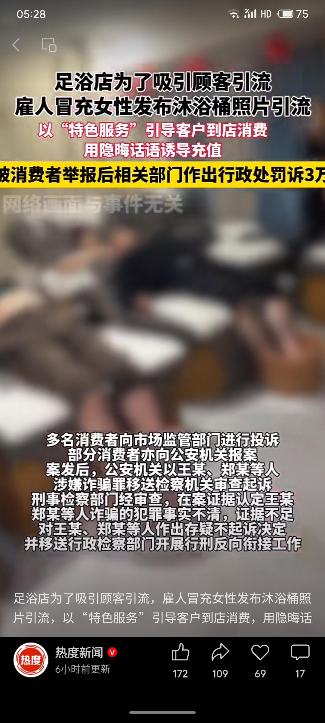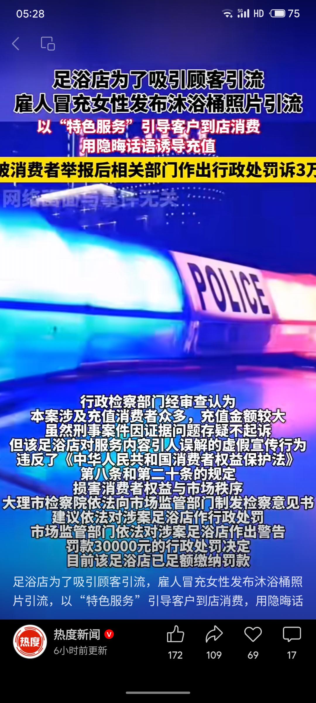 云南大理某足浴店为引流,雇佣10余人在社交平台冒充女性发布木桶浴照片,以“特色服务”为噱头,用隐晦话术诱导男性顾客到店充值。经消费者举报,市场监管部门认定其构成虚假宣传,最终对该店处以警告并罚款3万元的行政处罚。