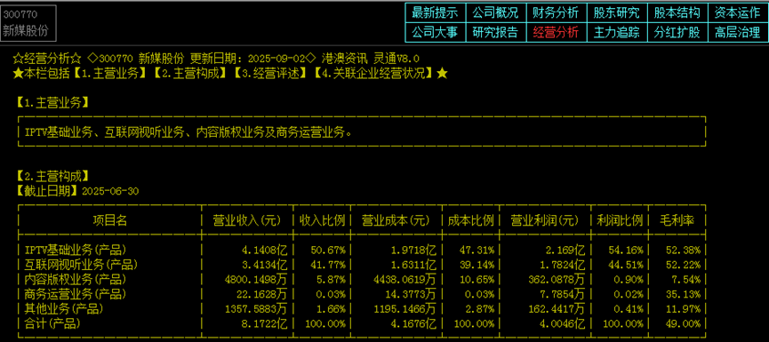 新媒股份是广东广播电视台旗下新媒体公司,核心竞争力在于其稳固的牌照壁垒和独特的市场定位。公司是经广东广播电视台授权,独家运营广东IPTV集成播控服务、互联网电视集成服务和内容服务的正规军。这一资质壁垒使其在市场竞争中占据了先天优势。IPTV业务作为公司的主要收入来源,表现稳健。截至2025年6月底,公司IPTV基础业务有效用户达2080万户,同比增长2.51%。在广东省内,公司保持与广东移动、广东电信、广东联通三大运营商的稳定合作。通过创新品牌活动与精准营销,提升品牌声量与品牌热度。今年以来,围绕“喜粤TV”品牌,公司积极开展品牌推广及线上营销活动,策划并落地《南方小记者之喜粤TV研学游》、《α粤新声·喜粤TV少儿脱口秀》两大主题活动,不断提升品牌声量;公司同时推出“喜粤奇妙夜”系列演艺项目,携手明星及乐队于大湾区核心城市举办多场Livehouse演出与Talkshow表演,持续带动品牌热度。