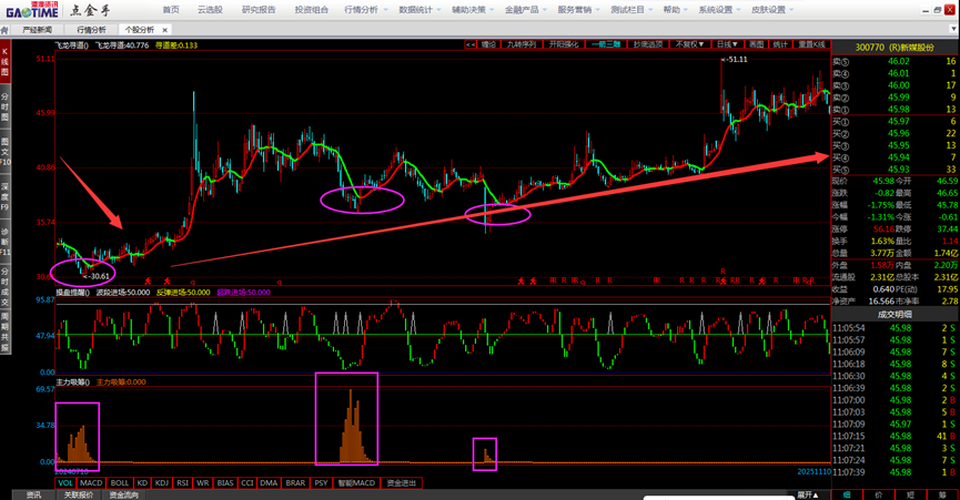 公司股价前期从高位一路下跌回调,下跌回调到30元附近触底站稳,一直横盘调整,随着大盘强势行情带动,该股也放量拉升,趋势开始转向向上,一路波段上涨,据港澳资讯点金手中的一箭三雕指标显示,在下跌回调过程中,都显示主力吸筹动作,主力资金逢低大幅吸筹,特别是近期回调低位时。目前股价在60日均线形成中长线支撑,短期20日均线往上形成金叉,趋势动能变强,短期有望保持强势。有放量突破可能。上方是前期高点,套牢盘较多,压力较大,需要时间消磨。