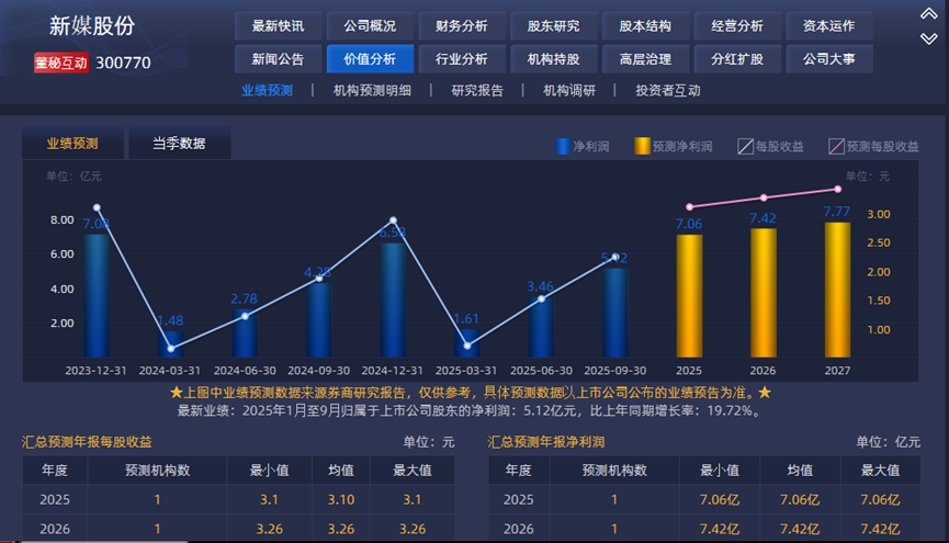 截至2025-11-11,半年以内共有1家机构对新媒股份的2025年度业绩作出预测;预测2025年每股收益3.10元,较去年同比增长7.27%,预测2025年净利润7.06亿元,较去年同比增长7.27%。