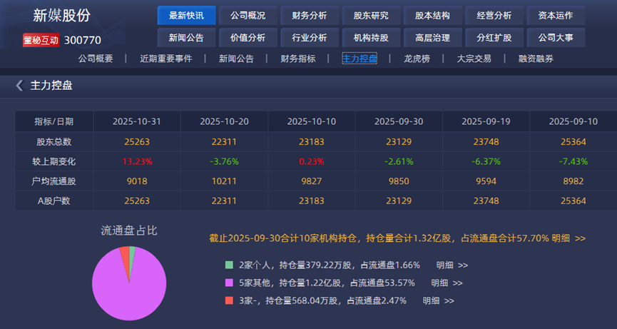 主力控盘方面,据港澳资讯统计,截止2025-09-30数据,合计10家机构持仓,持仓量合计1.32亿股,占流通盘合计57.70%。其中5家其他,持仓量1.22亿股,占流通盘53.57%,3家-,持仓量568.04万股,占流通盘2.47%,2家个人,持仓量379.22万股,占流通盘1.66%。主力流通盘占比比较大。机构持仓情况来看,据已公布的2025年三季报机构持股数据,目前公布机构37家,累计已公布持股1.24亿股,累计持仓比例54.31%,其中基金机构持股623.11万,占比2.73%。筹码集中度来看,股东户数从今年9月后有所收拢,到10月底有所分散,不过还是维持在2.5万户左右。