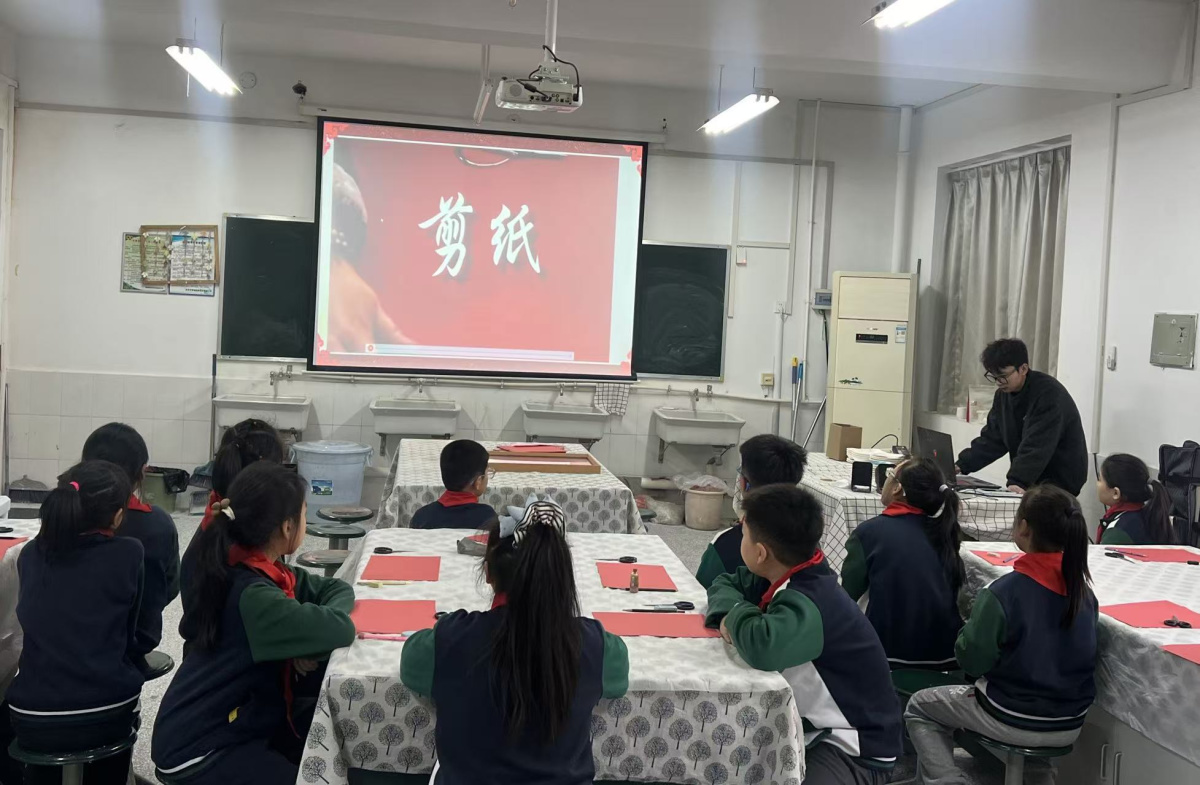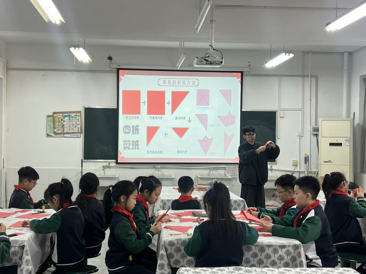 随后,老师耐心地示范剪纸的基本技法,从折纸到画图再到裁剪,每一步都讲解得细致入微。孩子们认真地跟着老师的步骤操作,教室里只听见纸张的翻动声和剪刀的咔嚓声。