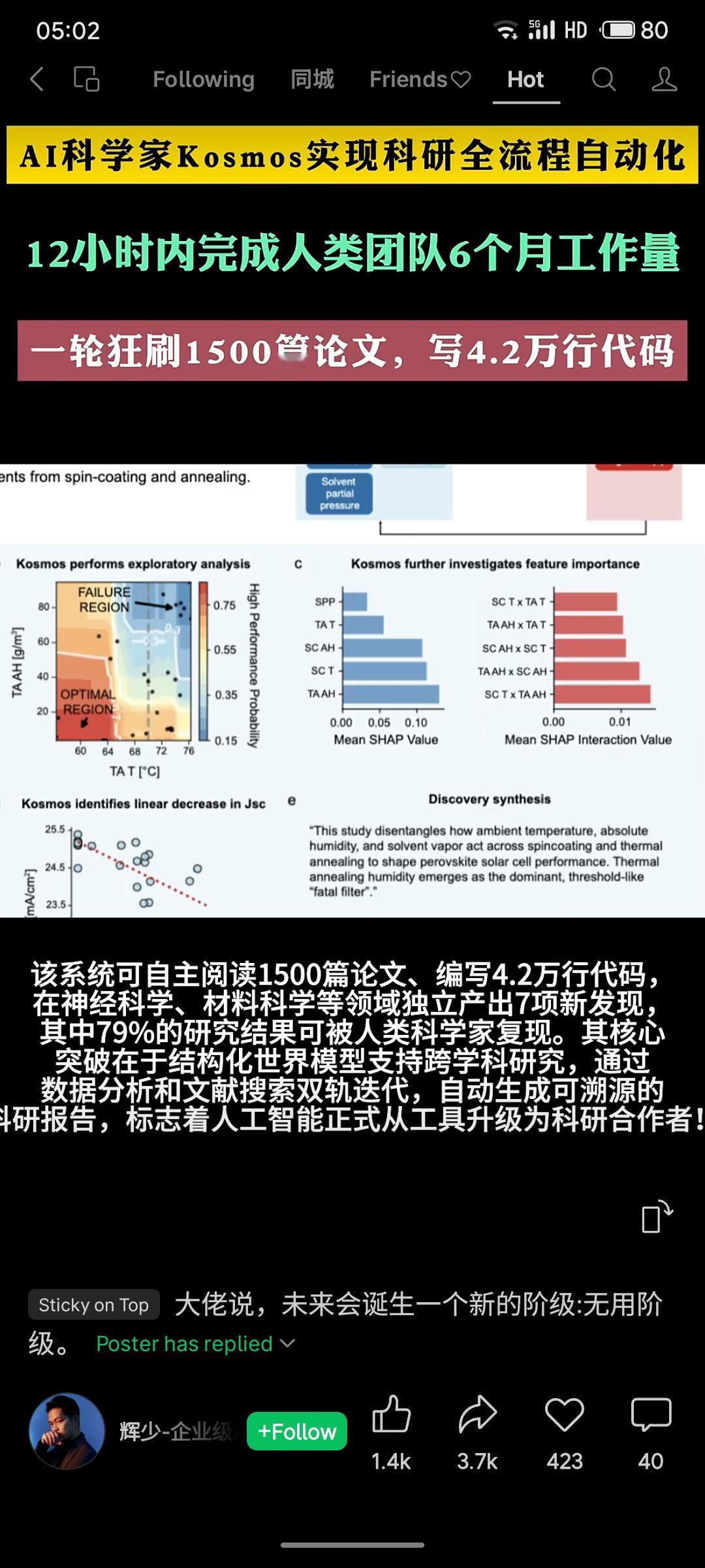 AI科学家Kosmos实现科研全流程自动化,仅用12小时就能完成人类团队6个月的工作量。该系统可自主阅读1500篇论文、编写4.2万行代码,在多个科学领域独立产出新发现,其中79%的研究结果能被人类科学家复现,标志着AI正式成为科研合作者。