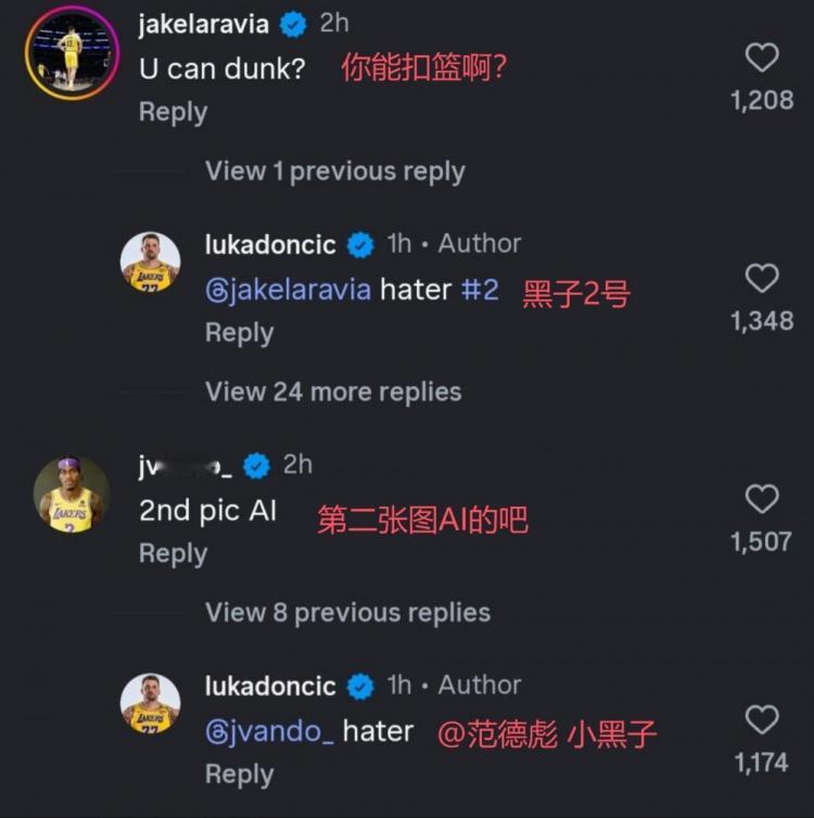 湖人队内这氛围真不错~ 东契奇双手暴扣后晒图片炫耀 范德彪:照片是P的吧 东契奇回复:小黑子 拉拉维亚:你居然能扣篮? 东契奇回合:小黑子2号! 老东家独行侠刚把nico炒鱿鱼,球队水深火热。 东契奇在新东家这里打情骂俏,和里夫斯天天斗嘴,和拉拉维亚成天闲扯淡,球队成绩目前也还不错,和独行侠形成鲜明对比。