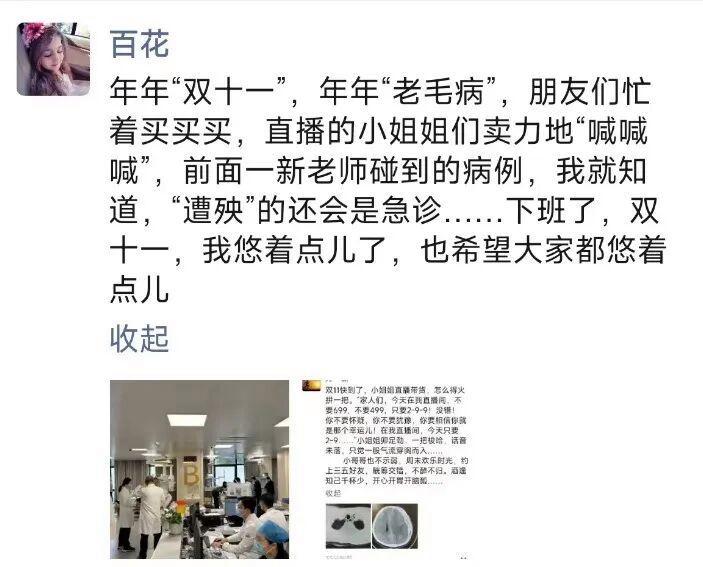 “年年‘双十一’,年年‘老毛病’,朋友们忙着买买买,直播的小姐姐们卖力地‘喊喊喊’……我就知道,‘遭殃’的还会是急诊……”刚下夜班的浙江省中医院钱塘院区急诊医学科王牡丹医生在朋友圈发出提醒,道出了购物狂欢背后,不少人的健康代价。