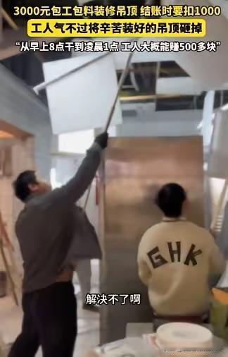 “太缺德了!”近日,湖北武汉,一老板找人做吊顶,谈好了3000元包工包料,工人从早上8点一直忙到凌晨1点才做完,可结账时,老板却说做的不合适,坚决要扣1000元,工人气不过,将装好的吊顶全拆了。网友:太欺负人了! 这事儿最让人憋屈的是那17个小时的连续劳作。清晨到凌晨,工人们拼的是体力,耗的是精力,午饭匆匆扒拉几口盒饭,就为赶在凌晨一点前完工。三千块钱听着还行,可扣除材料费,整个团队实际能拿到手的工钱才五百多块。平均下来每人也就百来块收入,这已经不是廉价劳动力能形容,几乎是挣的辛苦血汗钱。 店主陈先生事后砍价的做法确实不地道。口头约定也是具有法律效力的,如果对工艺不满意,合理做法应该是协商返工整改,而不是在完工后直接砍掉三分之一报酬。这种结账时突然变脸的做法,透着点刻意刁难的味道,也难怪网友一边倒批评店主“太欺负人”。 不过工人们拆吊顶的举动,虽然解气,却把自己从有理变成了理亏。吊顶一旦安装完成,就成为了业主的财产,工人无权私自拆毁。这么一砸,不仅之前17个小时的辛苦白费,还可能面临赔偿甚至法律风险,实在得不偿失。连到场民警都表示老板不该扣这么多钱,但也无法认可工人的过激行为。 这起纠纷像一面镜子,照出了装修行业普遍存在的隐患——口头约定的随意性。双方全凭熟人介绍和口头承诺就开工,工艺标准、验收流程、付款细节全凭感觉。北京西城法院的调研就指出,这种没签合同就开工的行为,往往是日后纠纷的“伏笔”。要是开工前能有一纸简单的协议,写明材料规格、工艺要求和验收标准,很多麻烦根本不会发生。 更深层看,这场冲突其实是底层劳动者权益保障缺失的缩影。工人们干着最累的活,拿着微薄的报酬,还随时面临被克扣的风险。《劳动法》明确规定工资应当按时足额支付,不得克扣或无扣拖欠。但现实中,缺乏合同的保护让他们维权艰难。这也是为什么工人被逼到用“砸掉劳动成果”这种极端方式抗议,本质上还是正规维权渠道不畅或成本过高下的无奈之举。 这件事没有赢家。店主的新店开业计划肯定受影响,工人不仅没拿到钱还可能惹上官司。它提醒每个需要装修的人,规则和尊重同样重要。对雇主而言,花钱买服务不等于可以随意对待劳动者;对施工方来说,辛苦付出值得被尊重,但维权必须在法律框架内进行。 各位读者你们怎么看?欢迎在评论区讨论。