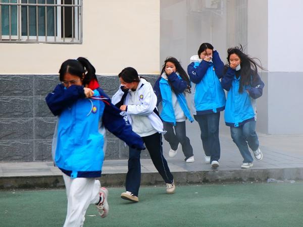 12时40分,随着总指挥一声令下,消防演练正式拉开帷幕。模拟发生火情,烟雾悄悄在教学楼和宿舍楼的楼道弥散,发现火情的老师立刻向学校汇报,接着校园内响起急促的火警警报声,现场指挥王俊奇主任立刻吹响两长一短的疏散哨音。霎时间,全体师生进入紧急状态。这时,楼梯道内已经烟雾弥漫,气味刺鼻,各班学生在班主任或各楼层安全岗老师的沉着指挥下,迅速用湿毛巾或衣袖捂住口鼻,猫着腰,按照预定疏散路线,分两列纵队靠右快速撤离。大家紧张而不慌乱,紧凑而不推挤,行动迅速,配合默契,整个过程井然有序。