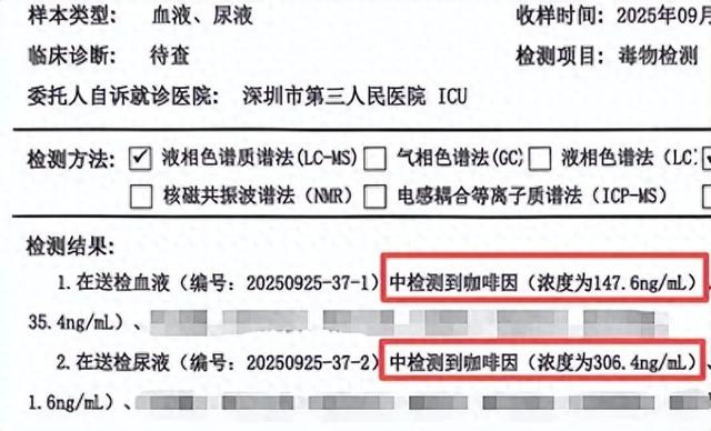 在患者血液样本中(距离摄入时间约40个小时)检测出咖啡因超标。