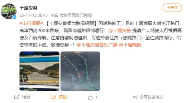 “十堰交警”微博11月12日上午发布紧急路况提醒:因道路施工,十堰发展大道浙江路口离华西岗200米路段,目前实施双向限制通行。十堰交警提醒,广大驾驶人请通过高德地图、百度地图查询实时路况,提前规划出行路线,建议绕行浙江路(法院路口)至仁威路。