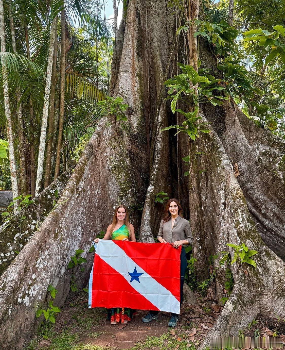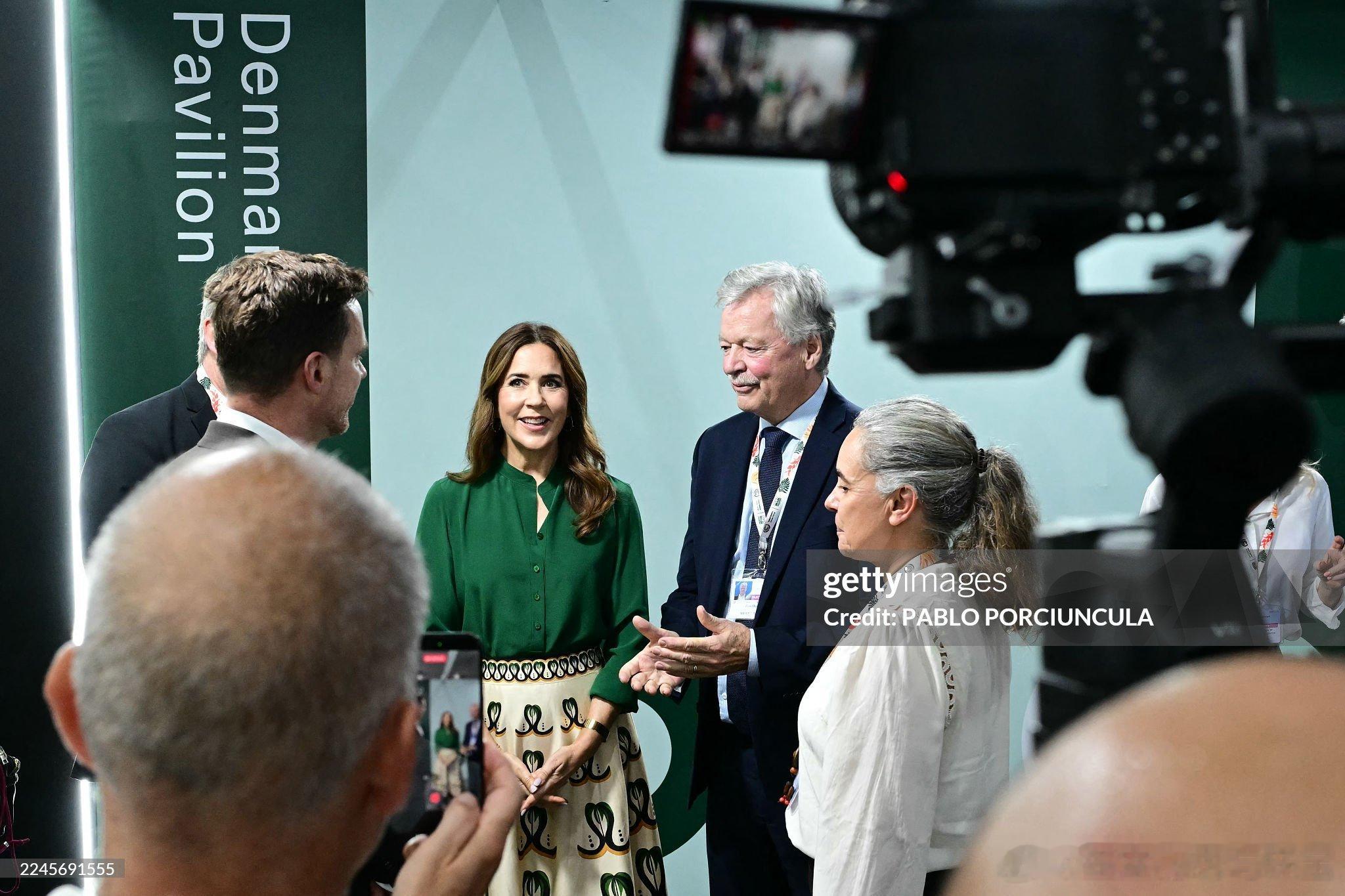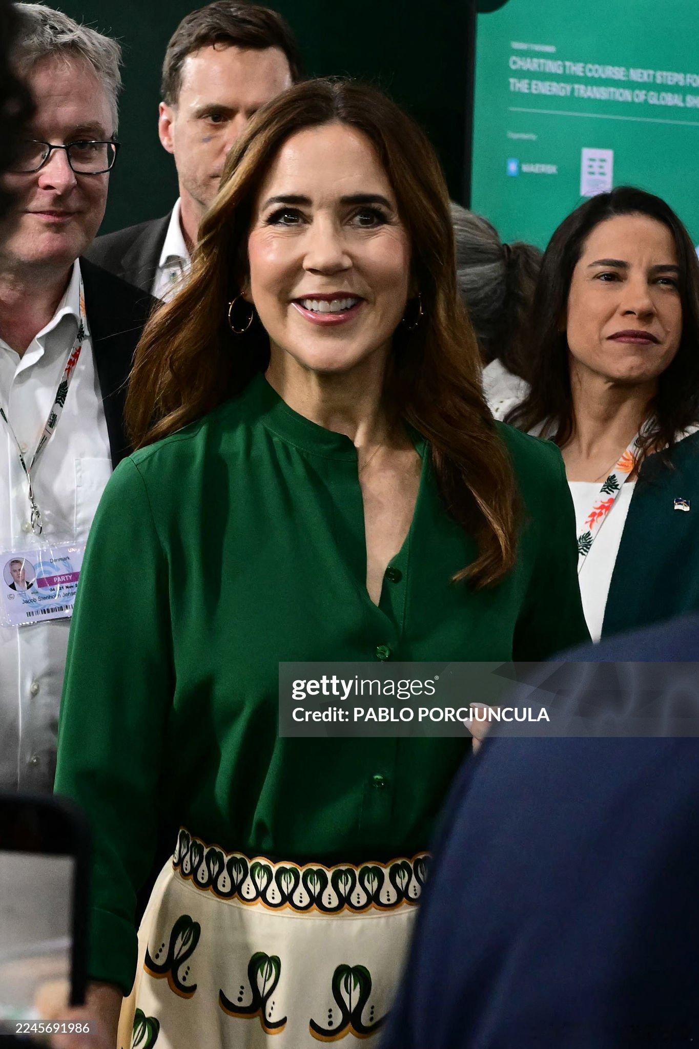 2025.11.11 丹麦王后玛丽正式访问巴西,出席在巴西贝伦举办的联合国气候变化大会(COP30),另外还参观当地的一个可可生产基地,大玛丽的绿色上衣来自Stella McCartney,印花半裙来自FARM Rio。