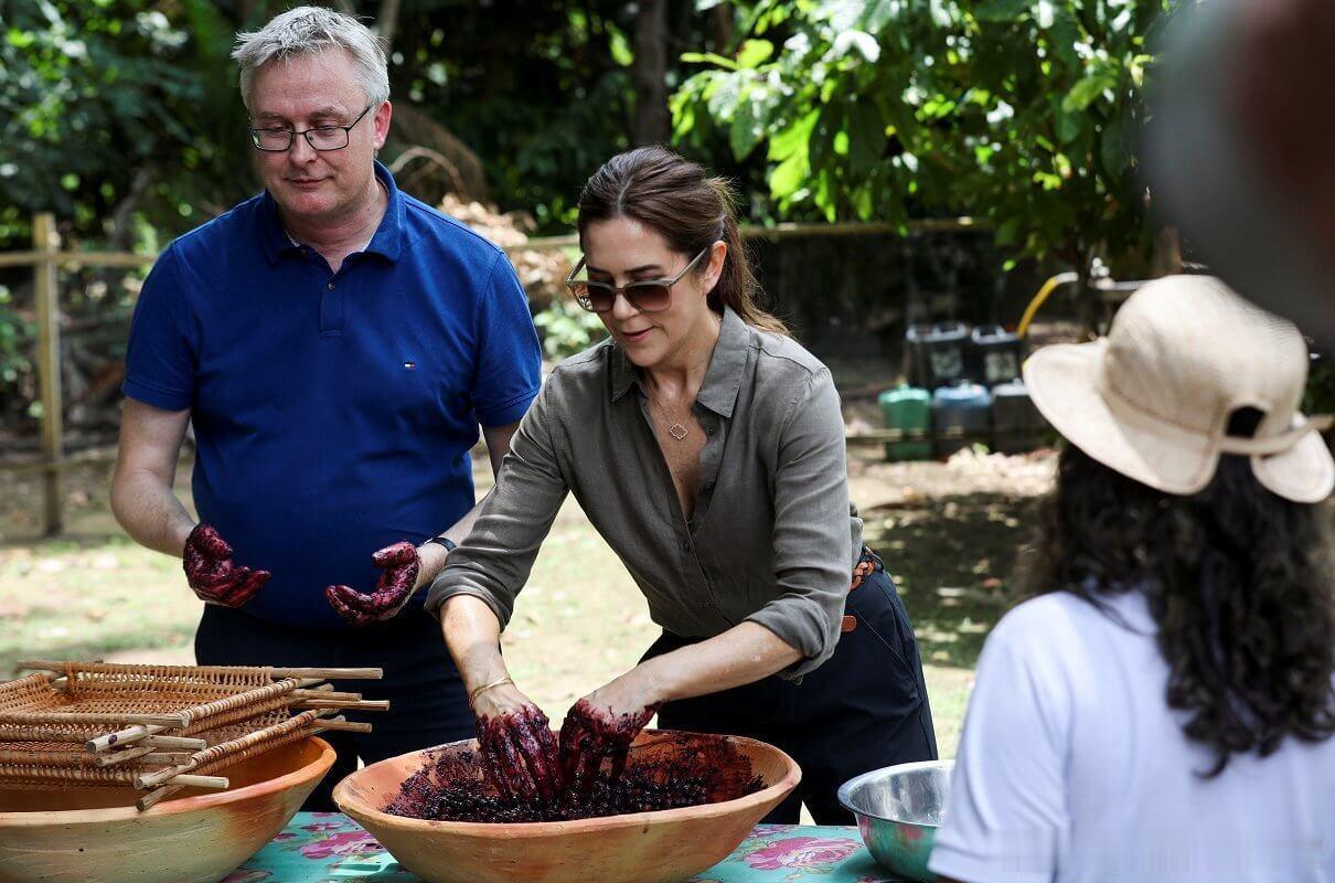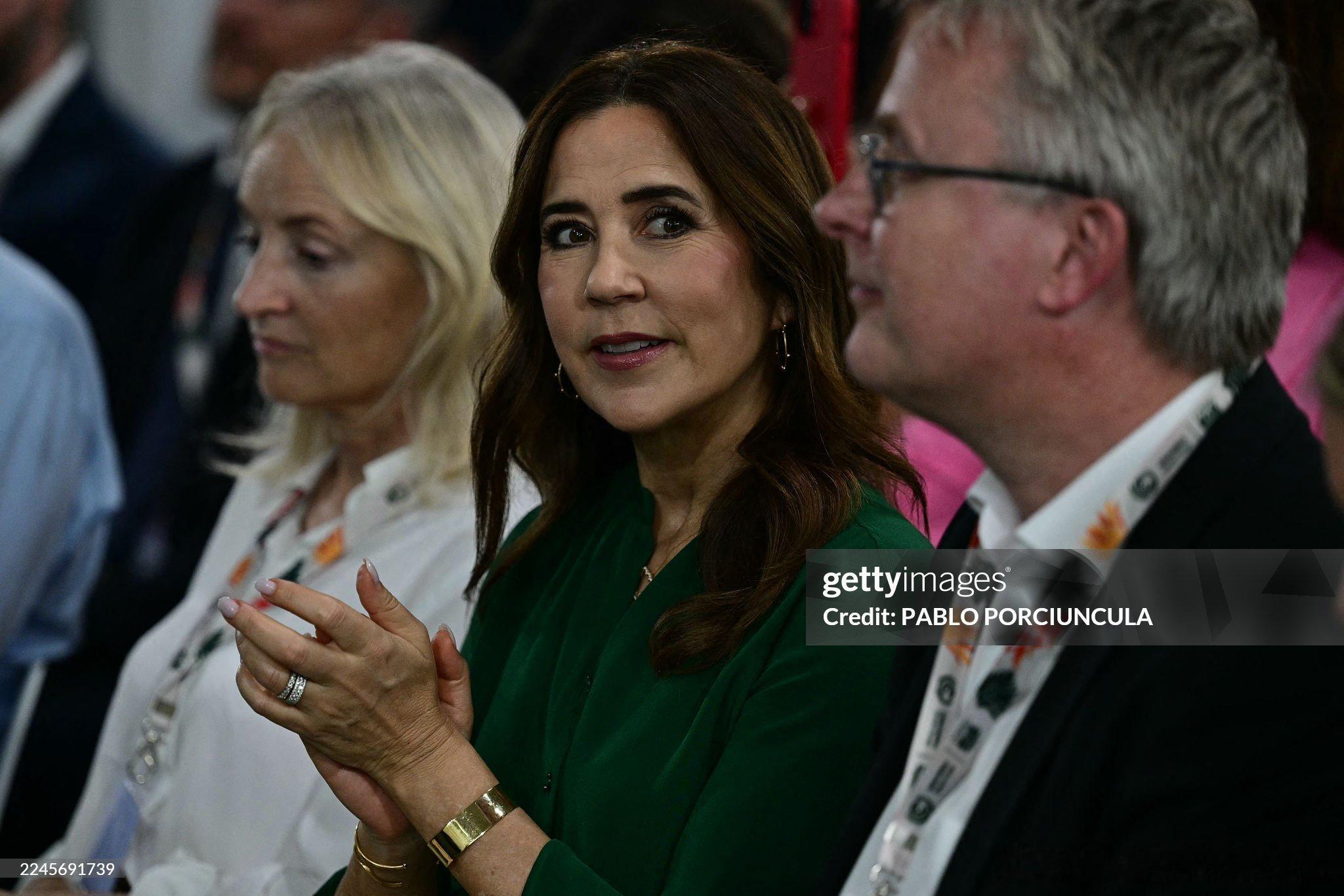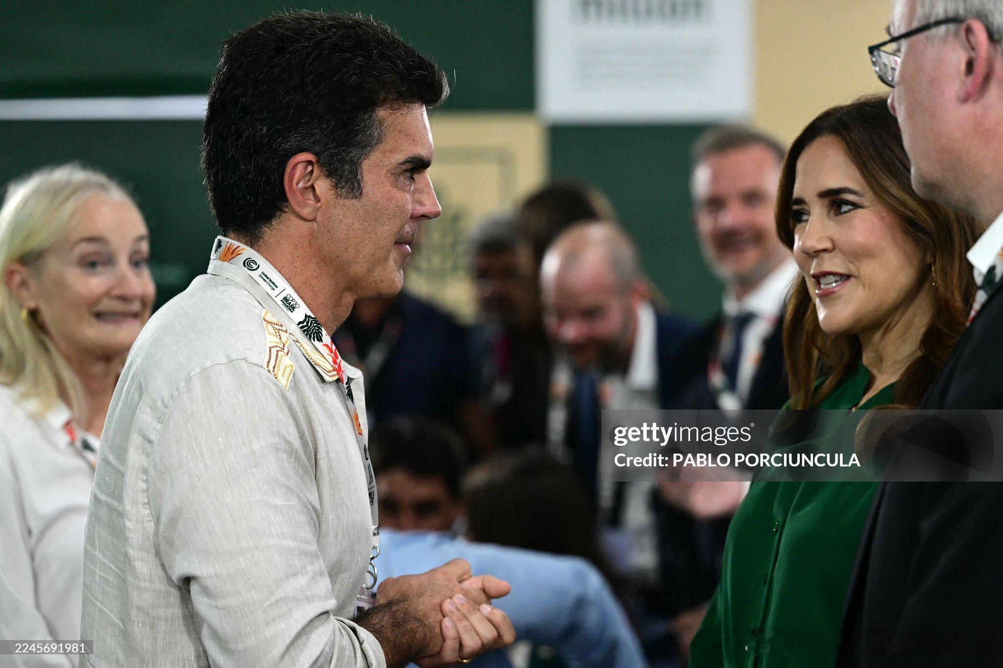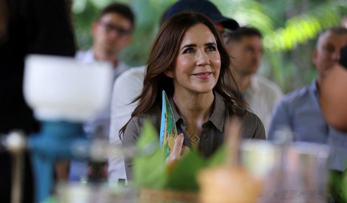 2025.11.11 丹麦王后玛丽正式访问巴西,出席在巴西贝伦举办的联合国气候变化大会(COP30),另外还参观当地的一个可可生产基地,大玛丽的绿色上衣来自Stella McCartney,印花半裙来自FARM Rio。