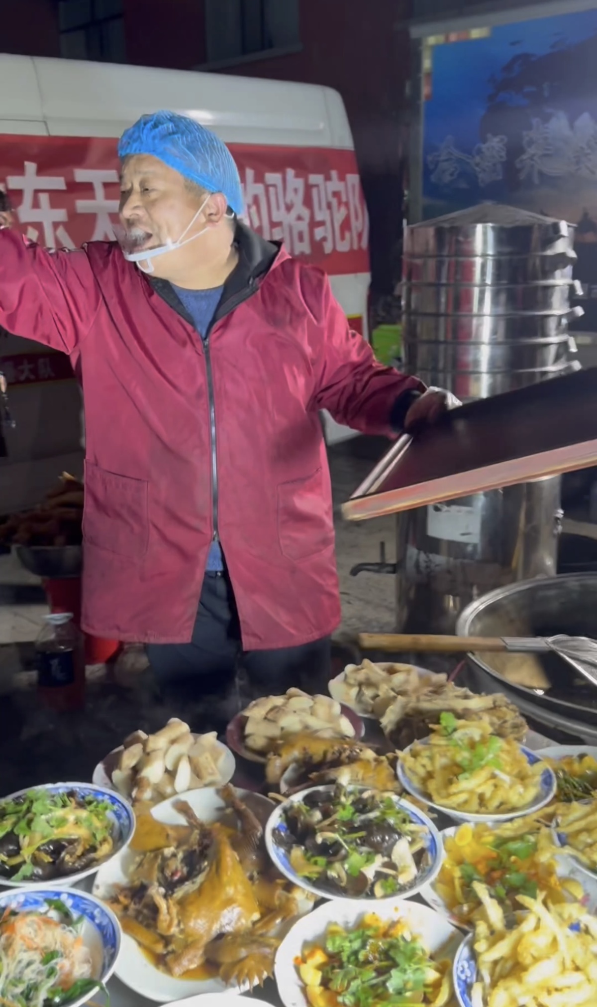 当天晚上,在距离洛阳千里之外的甘肃,一道道大菜依次上桌。牡丹燕菜、酥肉、焦炸丸子、连汤肉片……每端上一道菜,赵占胜都会报上菜名,每道菜的出场,都能引来阵阵欢呼。