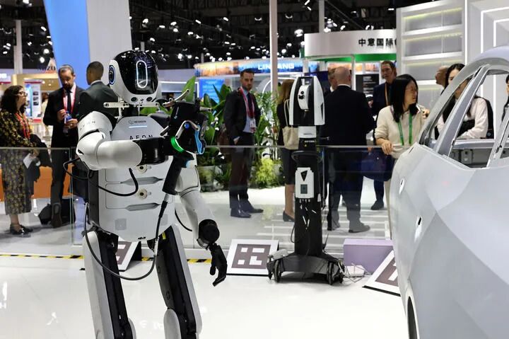在汽车及智慧出行展区特斯拉展台,两台人形机器人TeslaBot与无人驾驶电动车Cybercab同台亮相。在技术装备展区海克斯康展台,AEON工业人形机器人结合了“双足行走+轮式滑行”技术,能以2.4米/秒的速度自由移动,这是该型号机器人首次在中国展示其在工业自动化应用场景中的技能。