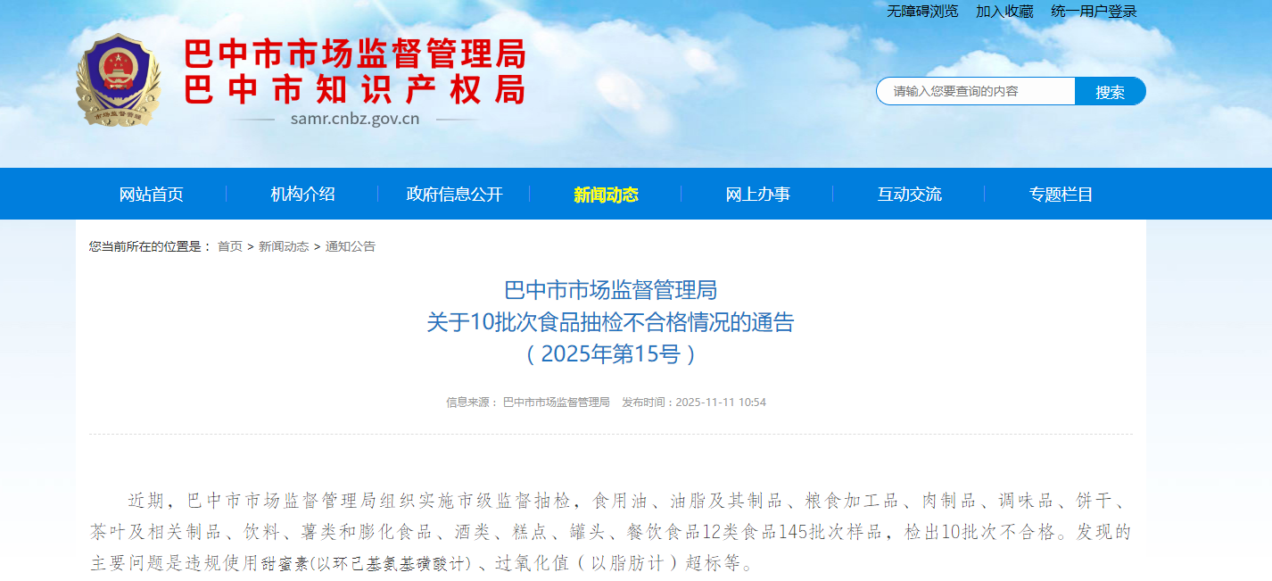 近期,巴中市市场监督管理局组织实施市级监督抽检,食用油、油脂及其制品、粮食加工品、肉制品、调味品、饼干、茶叶及相关制品、饮料、薯类和膨化食品、酒类、糕点、罐头、餐饮食品12类食品145批次样品,检出10批次不合格。发现的主要问题是违规使用甜蜜素(以环己基氨基磺酸计)、过氧化值(以脂肪计)超标等。