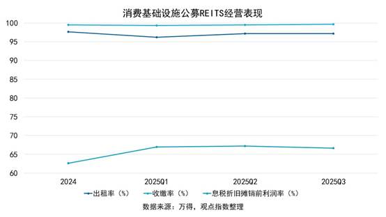 总得来看,消费REITs财务运营指标维持高位稳定,出租率、收缴率及利润率呈现“稳中有升”的态势,彰显资产质量与运营效率。2024年出租率97.68%、收缴率99.45%、EBITDA利润率62.59%;2025Q3出租率97.20%、收缴率99.65%、利润率66.61%,显示运营韧性在持续增强。