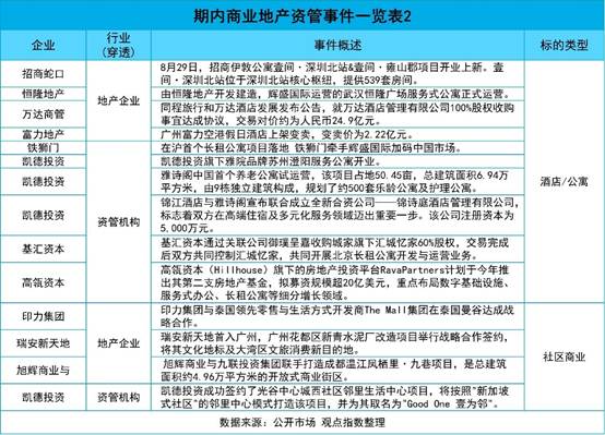 据不完全统计,报告期内观点指数监测下的样本资管机构和地产企业共录得39起商业地产资管事件,主要围绕商业地产项目的交易和管理运营进行,标的资产主要是购物中心、奥特莱斯、写字楼、酒店、长租公寓、社区商业等。