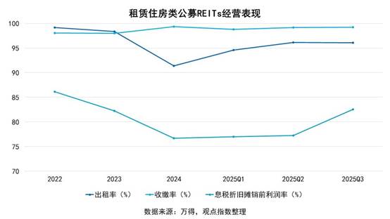 收缴率持续保持高位(2025年三季度达99.25%),凸显出管理团队在租金催缴、账期管控等方面的卓越执行能力与成熟运营体系。以国泰海通城投宽庭REIT为例,其所在的上海市已推行公积金按月提取直付房租政策,符合资质的租户可通过“随申办”政务平台实现公积金直接划转至出租方账户,该机制在确保租金及时收付方面发挥了显著的支撑作用。但EBITDA利润率从2022年的86.16%持续降至2024年的76.66%,2025年Q3回升至82.54%,反映了成本上升或收益增长放缓的盈利压力。