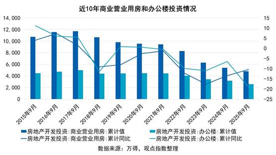 但同期办公楼投资额为2564.04亿元,同比下降19.10%,降幅较2024年同期扩大12.6个百分点。办公楼投资恶化更为显著,受企业办公需求缩减、空置率上升等因素拖累,投资意愿持续低迷。整体来看,回顾近10年的数据,商业地产的投资仍保持下降趋势,创历史新低,目前企业对商业地产的有关投资意愿仍较弱。