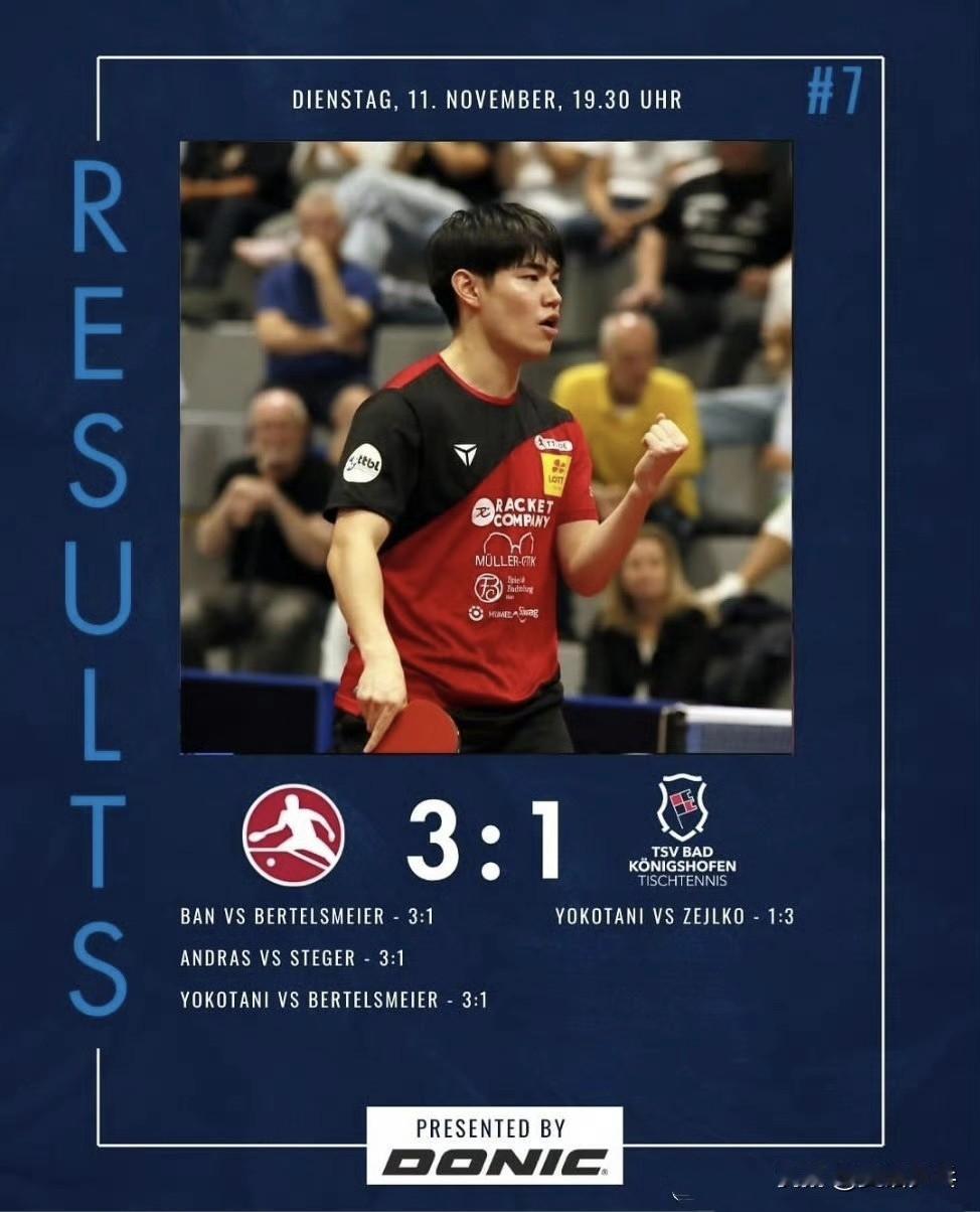 2025-2026赛季德甲乒乓球联赛 第七轮:11.11 萨尔布吕肯三比一格伦韦特斯巴赫 爱德华·约内斯库2比3篠塚大登(-5,12,5,-4,-5) 达科·约奇克3比0希普勒(7,8,5) 帕特里克·弗朗西斯卡3比0弗洛罗(5,7,3) 达科·约奇克3比1篠塚大登(7,8,-5,5) 霍姆堡三比一柯尼希斯霍芬 横谷晟1比3泽利科(-7,7,-6,-8) 伊沃班3比1贝塔斯迈尔(5,-7,7,13) 安多斯3比1斯特格(-4,4,10,6) 横谷晟3比1贝塔斯迈尔(5,14,-9,6)