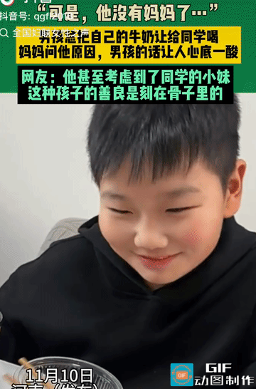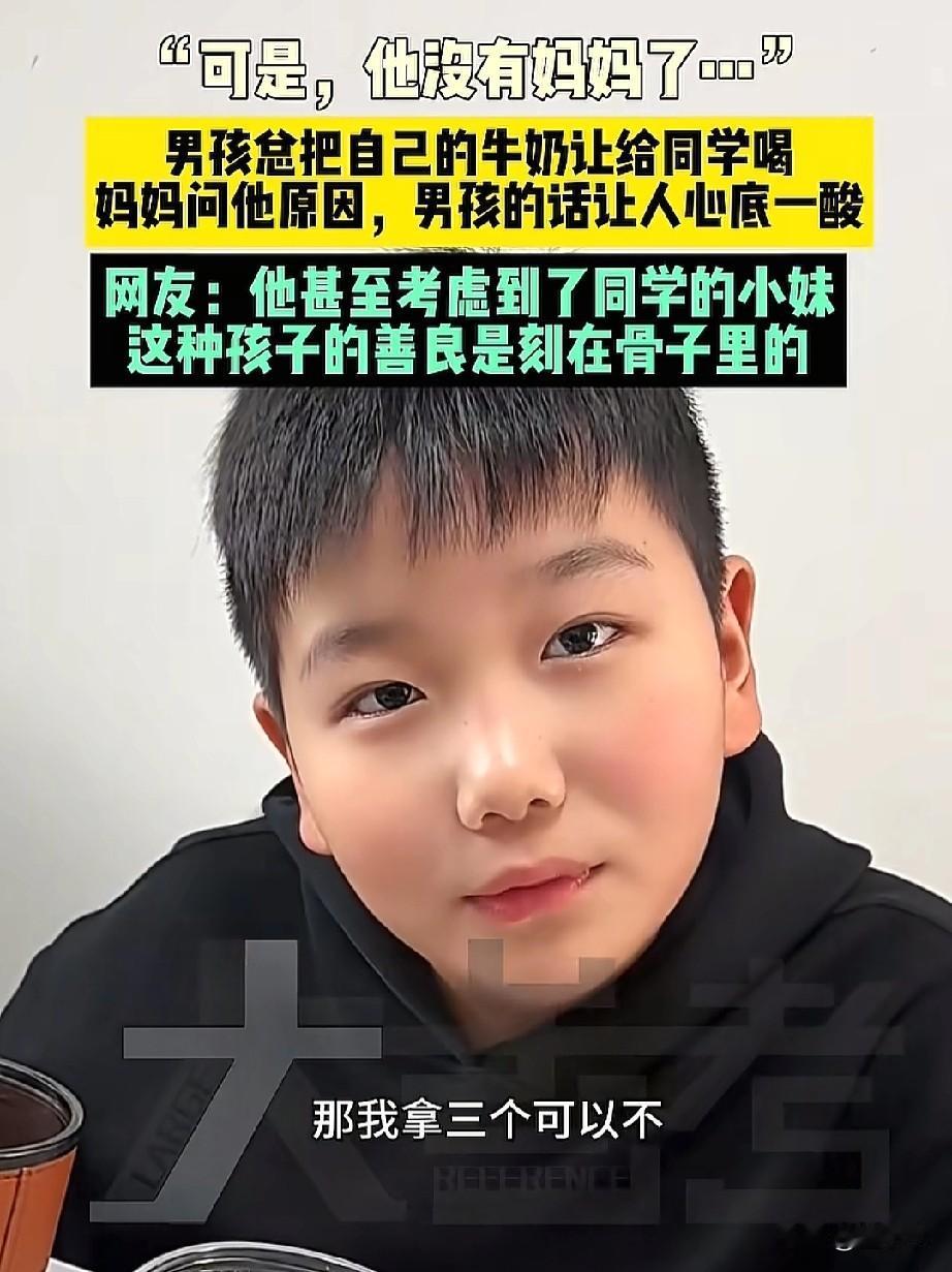 泪目了,他没有妈妈了!河南,一男孩每天都会把自己的牛奶给同学喝,妈妈很生气,当听到孩子说出的原因后,真的让人心酸。网友: 抛开成绩不谈,这孩子心地善良已胜过一切。 女子每天都会让孩子带一包牛奶,直到这一天她看到孩子把自己的牛奶给了一位同学,当时女子并没有上去指责孩子。 直到回来后,在吃饭时这才问了出来,当听到孩子说那个同学没有妈妈时,女子有一瞬间的顿住,接下来女子就让孩子每天拿两个一人一个。 但孩子却有点小心翼翼的询问,能不能拿3个,女子问出了为啥拿那么多,原来那个男同学还有一个妹妹,那奶他自己都舍不得喝,留给他的小妹喝,男孩在听到妈妈允许后,开心的笑了出来。 他没有妈, 他还有个小妹, 他都舍不得喝。 这两句话真刀心。 这孩子即使学习不好,现在也都已经赢了,心地善良的小伙子,长大了一定有担当。 这也才是教育的真正意义,先育人再教书。