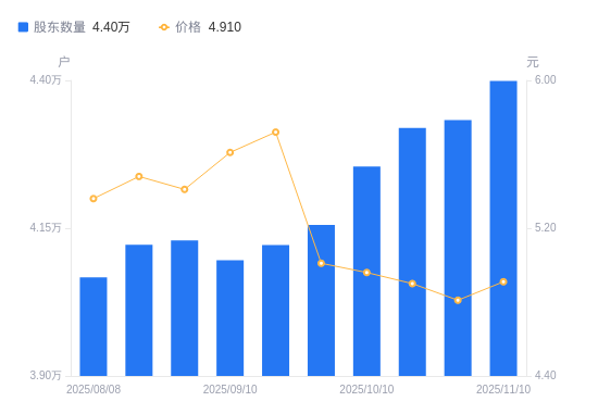 日期A股户数(户)流通A股户均持股数(股)户均持股市值(万元)2025-11-104398924485.9712.022025-10-314333124857.8011.962025-10-204319624935.4812.222025-10-104254325318.2212.562025-09-304155625919.5612.992025-09-194121526134.0114.952025-09-104095626299.2814.752025-08-294129426084.0114.112025-08-204122026130.8414.322025-08-084066626486.8214.20