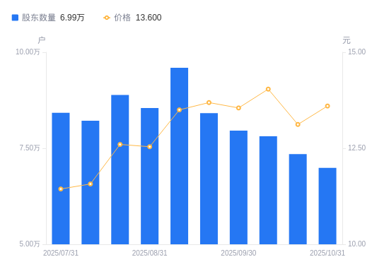 日期A股户数(户)流通A股户均持股数(股)户均持股市值(万元)2025-11-107221315379.6819.612025-10-316989015890.8721.612025-10-207349915110.5919.832025-10-107811014218.5819.962025-09-307960913950.8518.902025-09-208414313199.1218.072025-09-109594311575.7615.632025-08-318545912995.8616.302025-08-208889312493.8215.742025-08-108218913512.9215.63