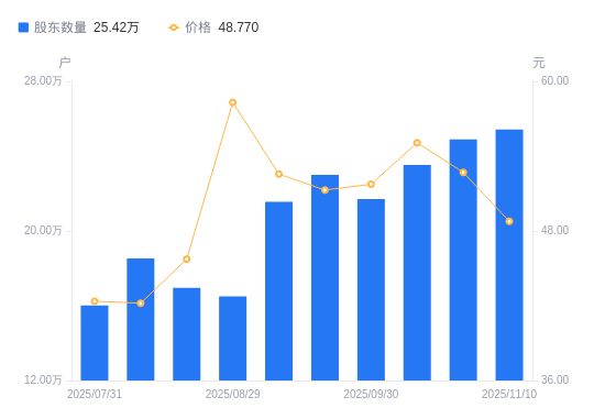 日期A股户数(户)流通A股户均持股数(股)户均持股市值(万元)2025-11-102542424174.0620.362025-10-312489274263.1822.472025-10-202352324511.3824.852025-09-302170594889.0925.302025-09-192299634614.7523.662025-09-102156014922.1525.872025-08-291650406430.0837.502025-08-201695536258.9328.632025-08-081852965727.1724.172025-07-311602016624.3128.06