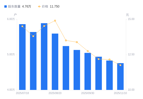 近一年(2024年11月30日至2025年11月10日),兆日科技A股股东户数从5.31万户,减低至4.76万户,降幅10.38%,区间股价下跌16.31%。