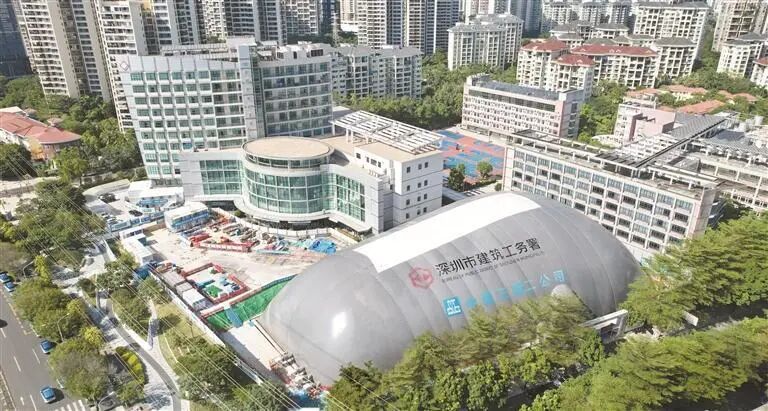 △深圳市眼科医院二期工程项目航拍图。施工现场采用气承式基坑气膜工艺,具有防尘、降噪、防雨、抗风等特点。深圳特区报记者杨浩翰摄