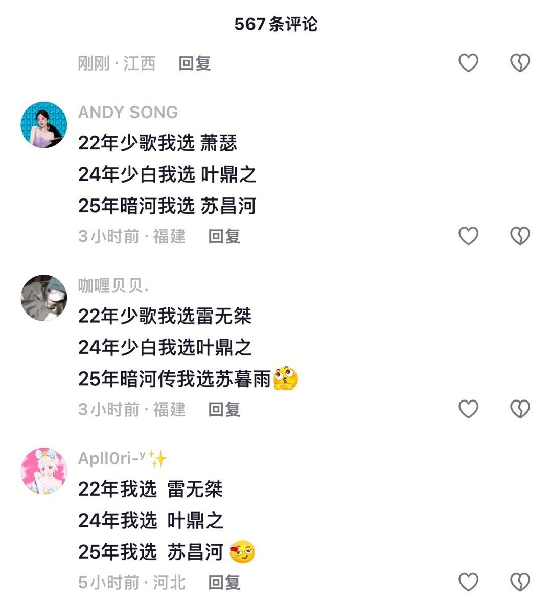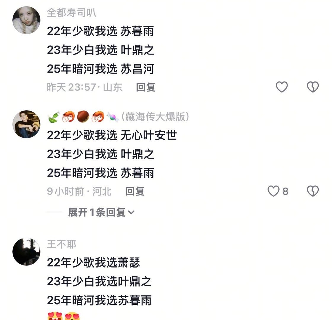 光看这个评论区就知道周木楠的少年江湖系列确实很群像,少歌和少白都是选男二或者其他非男主配角的多,暗河传苏暮雨和苏昌河差不多对半开,已经算比较能扛的男主了。