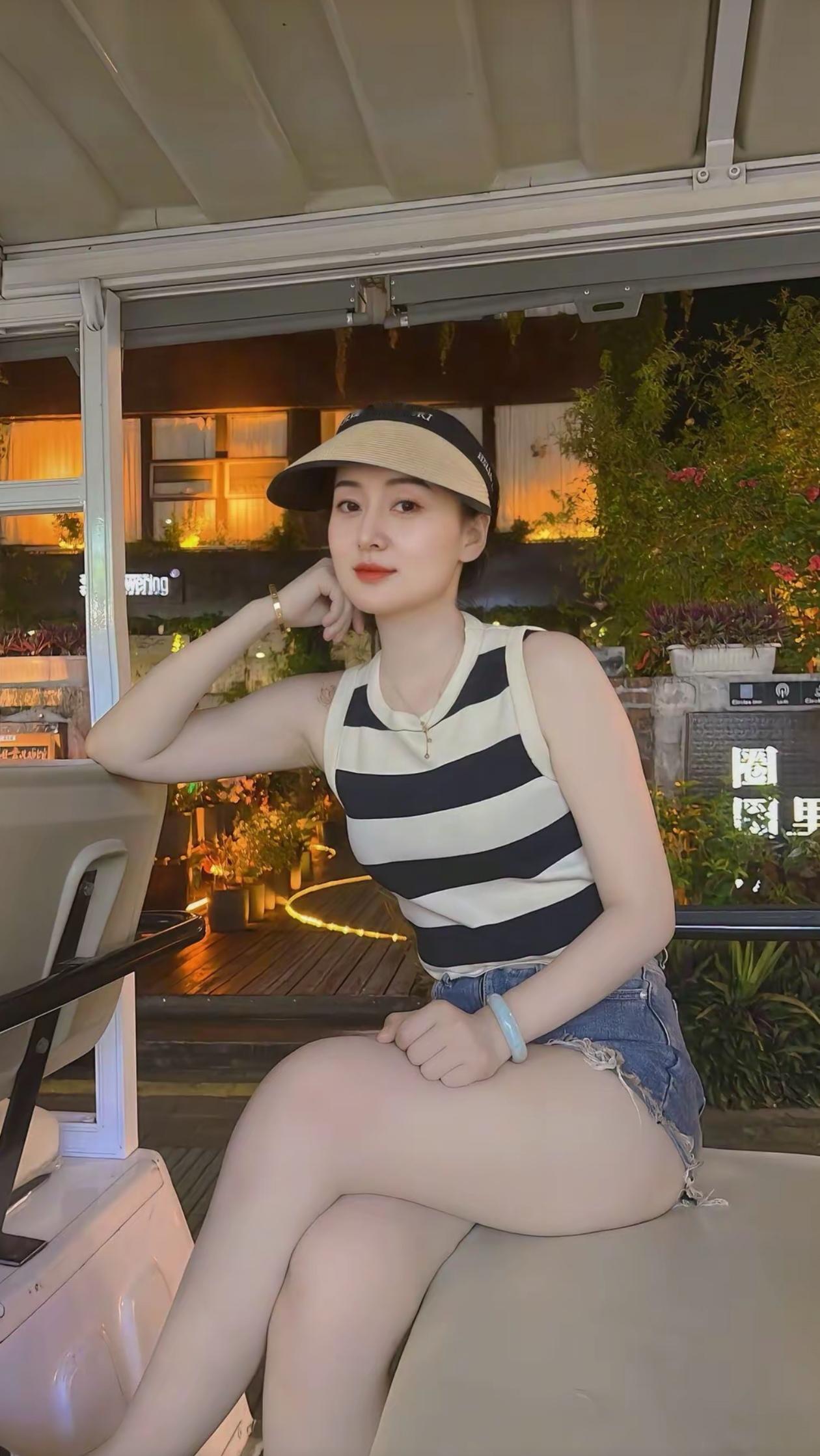 夏日夜晚的悠闲时光,条纹背心搭配牛仔短裤,轻松自在。