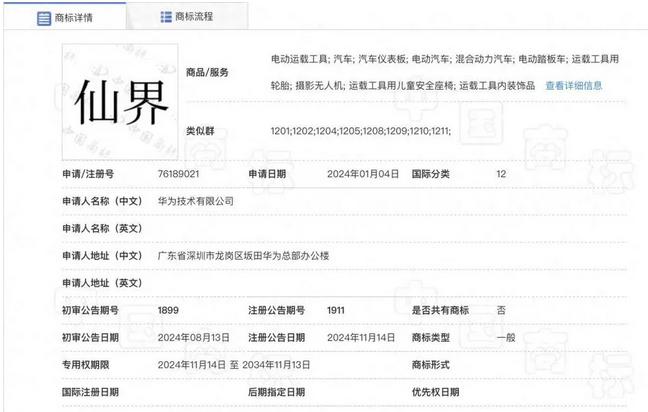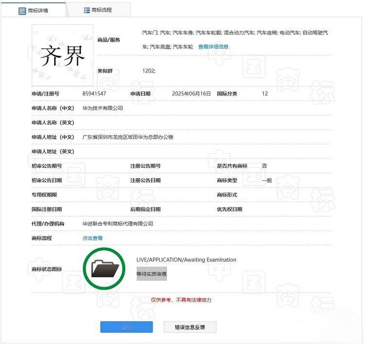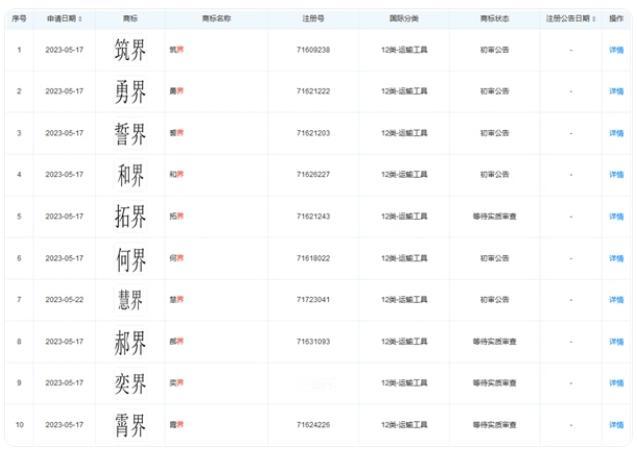 鸿蒙智行再申请“齐界”商标,“界”字商标已近200个。 11月12日,国家知识产权局商标局信息显示,华为技术有限公司于今年6月16日申请注册了“齐界”商标,目前处于等待实质审查阶段。 该商标归属于国际分类第12类,涵盖的商品和服务范围包括汽车门、汽车、汽车车身、汽车车轮毂、混合动力汽车、汽车座椅、电动汽车、自动驾驶汽车、汽车底盘、汽车车轮等。 值得一提的是,去年11月,华为还申请了一批名称均带有“界”字的商标,包括“仙界”、“天界”、“君界”、“峥界”和“江界”等。 而统计数据显示,华为已申请近 200 个包含“界”字的商标。 目前华为主导的鸿蒙智行共有五个“界”品牌,分别是问界、智界、享界、尊界和尚界。这些品牌分别代表了华为在智能汽车领域的不同定位和战略方向。 点个关注吧!汽节车社,车圈热点资讯每日一扫清!【来自懂车帝车友圈】