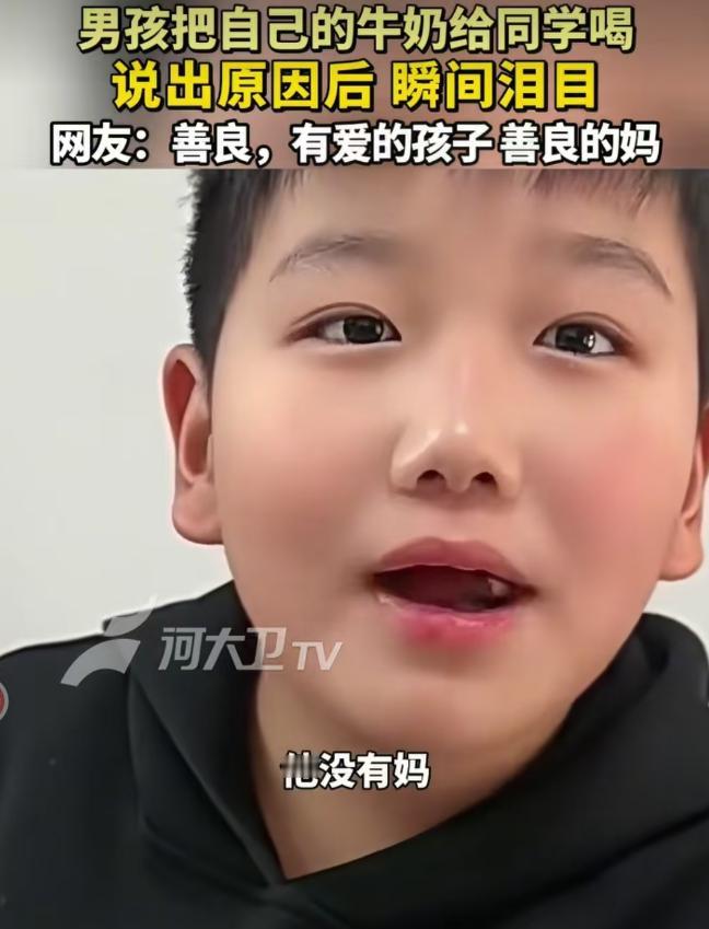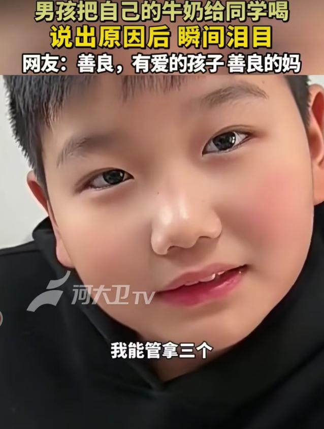 “这小男孩日后必成大器!”在河南,妈妈发现儿子最近有点反常——每天特意给他买的牛奶,他居然全给了同学,妈妈实在忍不住追问,儿子的回答让妈妈瞬间红了眼眶…… 河南家常菜的香气飘在厨房,妈妈端着咸菜馒头出来,盯着儿子饭碗旁没动过的牛奶盒,眉头拧成疙瘩。 这已经是第五天了,每天特意买的鲜牛奶,儿子总说忘了喝,今天放学接他时,明明看见他把牛奶塞给了同班男生。 “你又把牛奶给别人了?”妈妈把筷子往桌上轻放,语气带着点急。 儿子扒馒头的手顿了下,抬起头,嘴角还沾着馒头屑,眼睛亮得像浸在水里的黑葡萄:“你咋知道的?”“我亲眼瞧见了,”妈妈声音提了点,“人家爸妈不会给买吗?咱又不是多富裕。” 儿子放下筷子,小手在裤缝上蹭了蹭,轻声说:“他没有妈妈。” 五个字像细针,一下扎得妈妈说不出话,刚冒起来的火气“唰”地灭了,心口反倒揪着疼,她盯着儿子清澈的眼神,那里面没有丝毫犹豫,只有纯粹的认真。 这才想起,儿子班里确实有个总穿洗得发白校服的男生,家长会从没见过他家人。 “那明天带两盒,你俩一人一盒,”妈妈声音软下来,夹了块咸菜给儿子,没想到儿子脑袋一歪,眼睛里闪着期待的光:“能多带一盒不?”妈妈愣了:“两盒不够?” “他还有个小妹,”儿子掰着手指,“上次我看见他把牛奶藏书包里,说要带回家给妹妹喝,自己一口没动。” 这话刚落,妈妈的眼泪“啪嗒”砸在桌布上,她赶紧别过脸擦,喉咙里堵得发紧,好半天才挤出三个字:“管管管!”儿子没察觉妈妈哭了,听见答应,笑得露出豁牙,眼睛弯成月牙。 后来这事儿传到网上,好多人跟着动容,有人说这孩子肩膀上扛着大人都少有的共情,有人夸妈妈没浇灭孩子的善意。 其实最打动人的,是儿子没声张的细心,他从没在班里喊过同学的难处,只是悄悄把牛奶递过去,维护着同伴的体面;想起同学的妹妹,又主动开口要多带一盒,这份心思比牛奶还暖。 妈妈后来常给儿子带三盒牛奶,有时会加个鸡蛋,她渐渐明白,那些没进儿子肚子的牛奶,都变成了更珍贵的东西:孩子眼里的光,心里的软,还有面对弱小时本能的心疼,这比任何营养品,都更能滋养成长。 就像网友说的,这孩子现在能把牛奶分给需要的人,将来心里定然装着更大的世界,这份没被世俗沾染的善良,配上妈妈的理解与支持,可不就是成大器的底子。