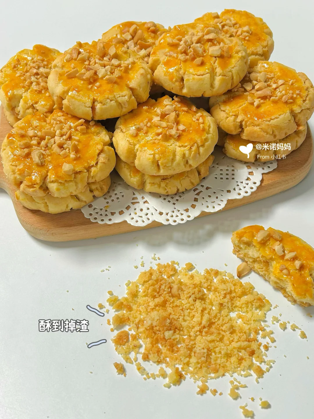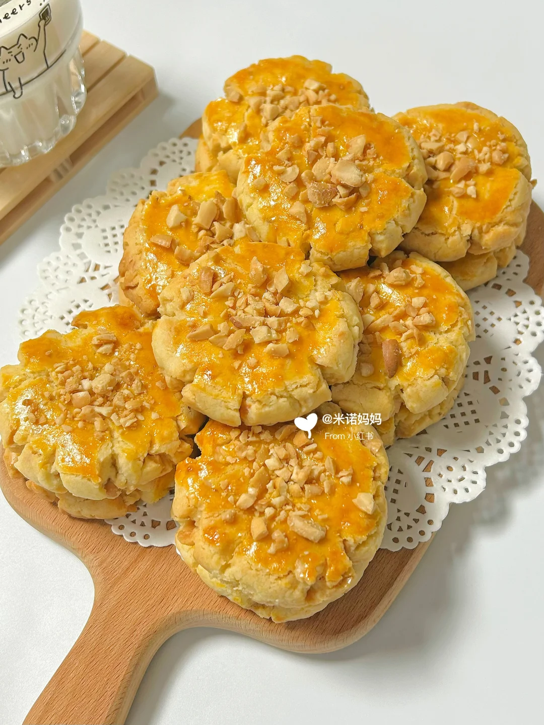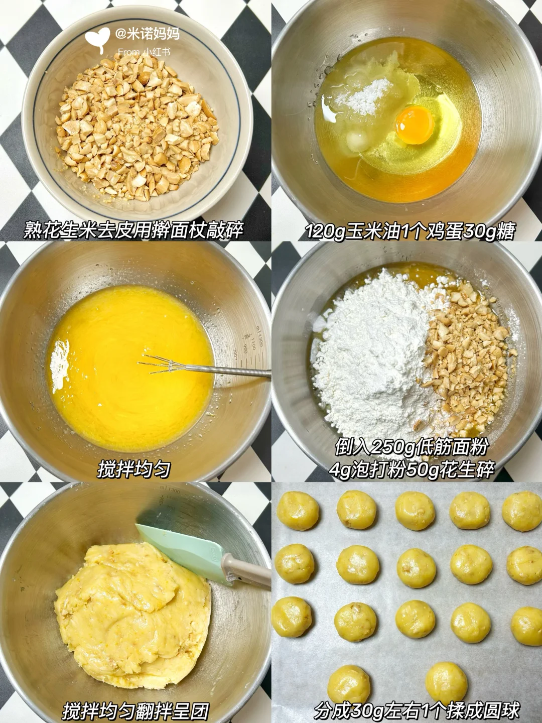 低筋面粉250g | 花生碎50g | 玉米油120g | 糖30g | 泡打粉4g | 🥚蛋1个 | 蛋黄液1个(刷表面)