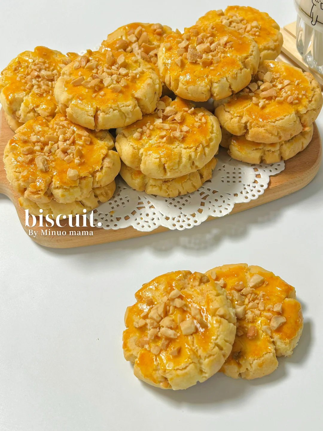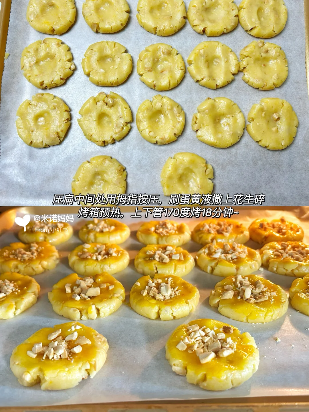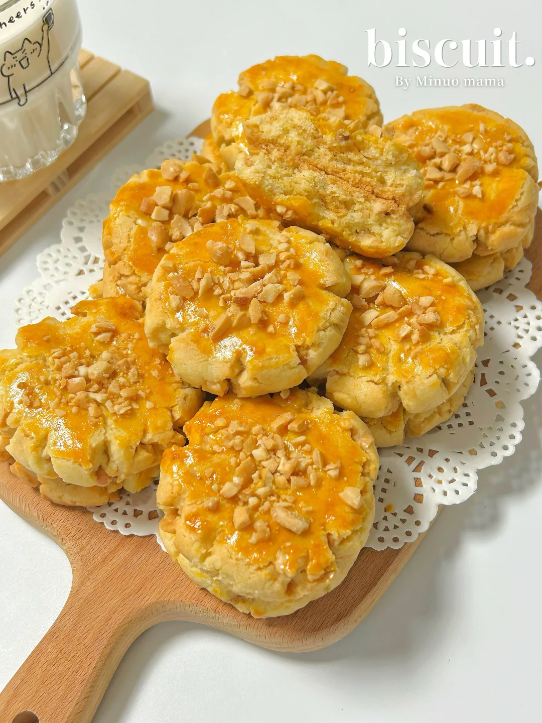 低筋面粉250g | 花生碎50g | 玉米油120g | 糖30g | 泡打粉4g | 🥚蛋1个 | 蛋黄液1个(刷表面)