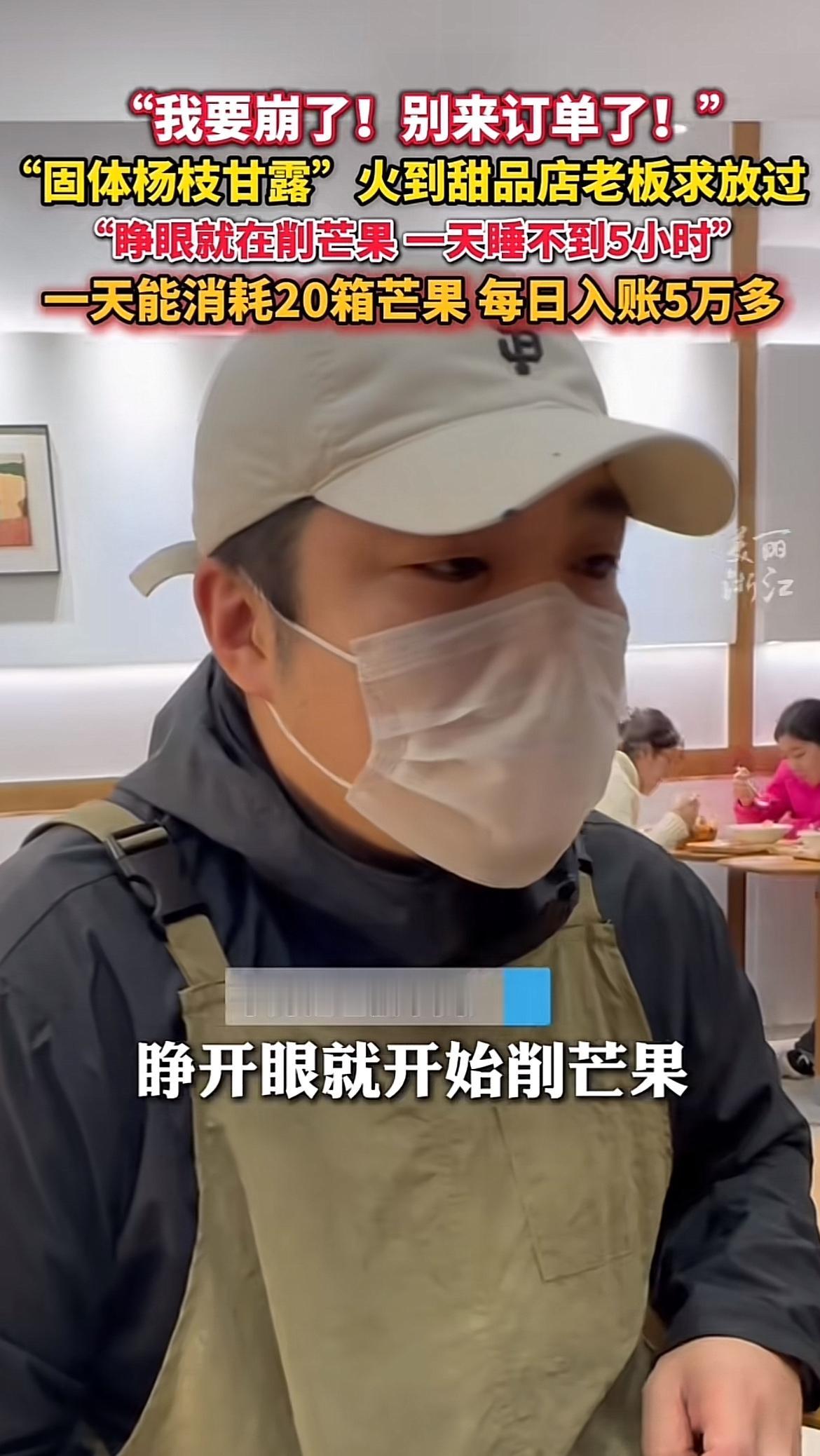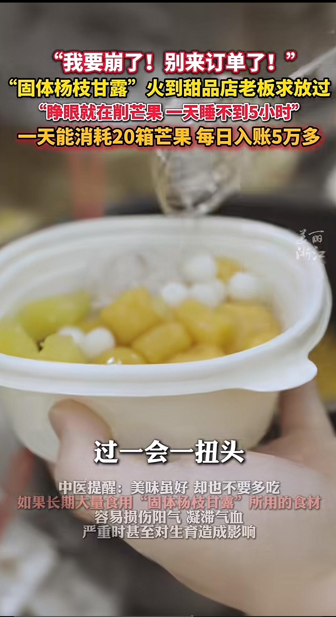 “固体杨枝甘露”要把我搞崩溃了,别再下订单啦!这“固体杨枝甘露”火到甜品店,老板都求大家放过。每天一睁眼就在削芒果,一天睡不到五个小时,一天能消耗20箱芒果。店里每日进账5万元。
