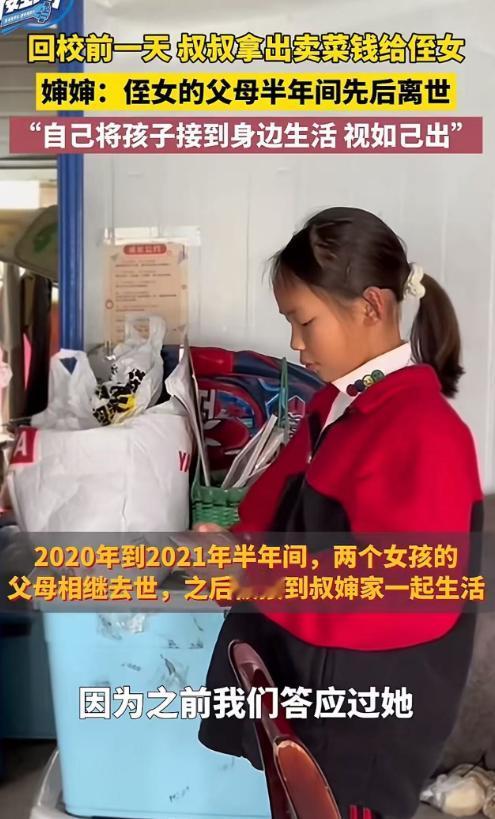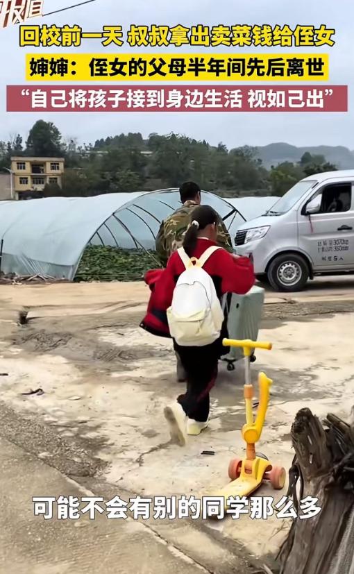 “这个叔叔婶婶火了!”贵州,哥哥嫂嫂去世后,弟弟把2个侄女接到家里住,回校前一天,弟弟拿出卖菜赚的钱给侄女,婶婶:“侄女的父母半年间先后离世,我们是孩子唯一的依靠,对他们视如己出!” 贵州一个小村庄里,靠卖菜过日子的夫妻俩,最近因为一段视频让全网心里发烫。 事情得从几年前说起,2020到2021那半年,厄运连着找上这个家,哥哥走了,没过多久嫂嫂也不在了,只留下两个十岁出头的小姑娘。 孩子们抱着膝盖缩在空荡荡的屋里,眼神怯生生的,连哭都不敢大声,好好的家一下塌了。 叔叔看着侄女们瘦小的身影,心像被针扎,他自己日子本就紧巴,每天天不亮就得去批发市场挑菜,摆摊到傍晚,赚的都是皱巴巴的零钱,家里还有自己的娃要养,可他还是咬咬牙跟老婆商量,想把侄女接过来。 没想到婶婶想都没想就点头:“接!都是自家骨肉,哪能不管?”当天就腾出房间,翻出干净衣服给孩子换上,还煮了热腾腾的饭菜。 从那天起,婶婶把俩侄女当亲闺女待,清晨提前备好早饭,盯着她们背上书包;晚上守着辅导作业,冬天先把被窝捂暖,夏天摇着扇子哄她们睡,那些没了的母爱,全靠她一点点用耐心补回来。 一晃几年过去,侄女们上了初中,叔叔心疼她们在学校受委屈,特意承诺每月给200块零花钱,“别的孩子有的,咱们闺女也不能少”。 回校前一天,叔叔收完摊回家,浑身沾着泥土和汗水,腰都直不起来,却第一时间摸出腰间的布包。 他把里面的零钱倒在手心,一张一张数,五块的、十块的,还有硬币叮当响,最后数出一百多块,全塞给侄女,自己只留十几块当第二天的本钱。 “拿着,在学校别省着,想吃啥就买,”他声音沙哑,手还沾着卖菜的泥点。 婶婶站在旁边拍视频,红着眼眶说:“侄女的父母半年间先后离世,我们是孩子唯一的依靠,钱不多,但答应孩子的事,砸锅卖铁也得做到,在难也不能亏了她们,得对得住哥嫂的在天之灵。” 这段视频一传到网上,评论区全是感动的话,有人说“这婶婶太难得了,亲妈未必能做到这样”,还有人讲“那些皱巴巴的零钱,是见过最美的钱”。 现在这对夫妻还守着菜摊,每天起早贪黑,侄女们在他们照顾下,性格开朗了,成绩也不错,没人想到,这么普通的卖菜夫妻,能把承诺扛了好几年。 这年头,有人为了利益争得面红耳赤,可这对夫妻偏偏用最微薄的收入,撑起了最沉的责任,他们没说过啥大话,就靠每天挑菜、摆摊、做饭、洗衣,把两个孤儿的日子暖得热气腾腾。 这哪是简单的亲戚情分?是危难里的担当,是没钱也不缺的善良,他们不是大英雄,却是两个孩子黑暗里的光,是这世上最实在的温暖。