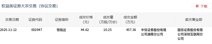 11月12日,恒铭达大宗交易成交10.25万股,成交额457.36万元,占当日总成交额的1.56%,成交价44.62元,较市场收盘价47.48元折价6.02%。