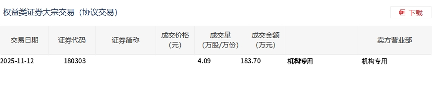 11月12日,华泰宝湾物流REIT大宗交易成交183.7万股,成交额752.07万元,占当日总成交额的56.37%,成交价4.09元,较市场收盘价4.078元溢价0.29%。
