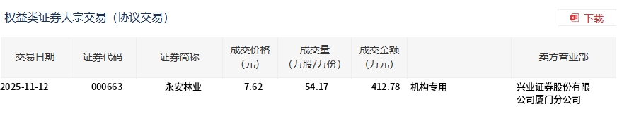 11月12日,永安林业大宗交易成交54.17万股,成交额412.78万元,占当日总成交额的2.37%,成交价7.62元,较市场收盘价7.71元折价1.17%。
