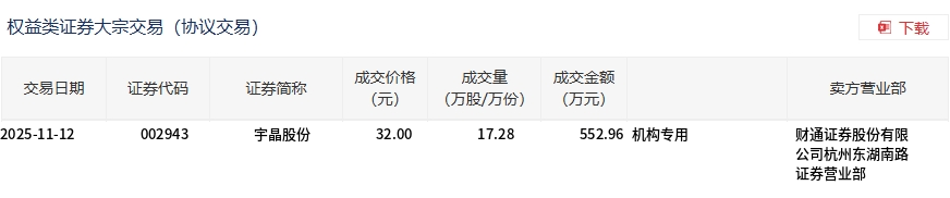11月12日,宇晶股份大宗交易成交17.28万股,成交额552.96万元,占当日总成交额的3.99%,成交价32元,较市场收盘价33.76元折价5.21%。
