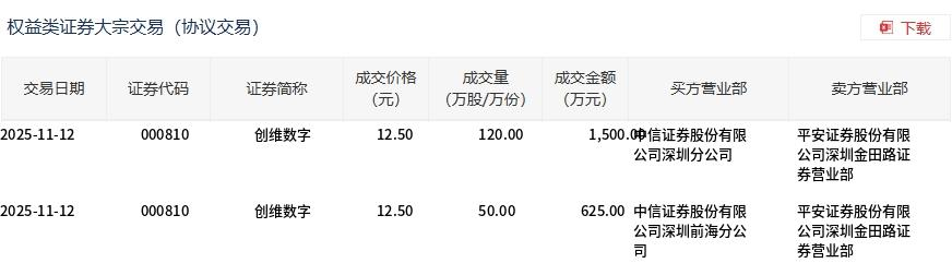 11月12日,创维数字大宗交易成交170万股,成交额2125万元,占当日总成交额的10.77%,成交价12.5元,较市场收盘价12.54元折价0.32%。